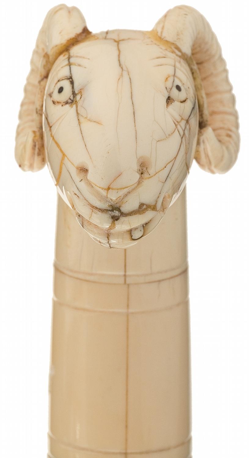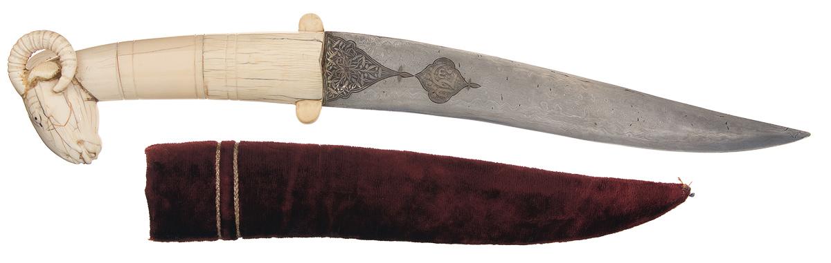 Blade is 9" long, with a slight forward cant to the spine, a 1 1/2" triangular panel of silver wire floral inlay on either side, and an untranslated inlaid symbol on the right. Grip is smooth ivory, with dual ball quillions and a ram-head pommel with carved-through horns and fine detail. OAL: 14 1/2" The sheath is covered in red velvet, with copper wire on the seam and in a pair of decorative bands near the throat.