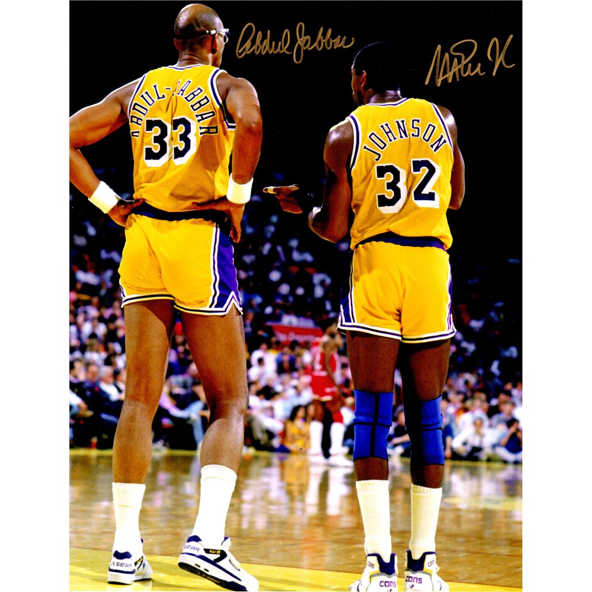 Kareem Abdul-Jabbar and Magic Johnson dual signed Los Angeles Lakers back of jerseys 16x20 photo. Item comes with a Schwartz Sports Memorabilia tamper-proof numbered hologram and Certificate of Authenticity which can be verified online.