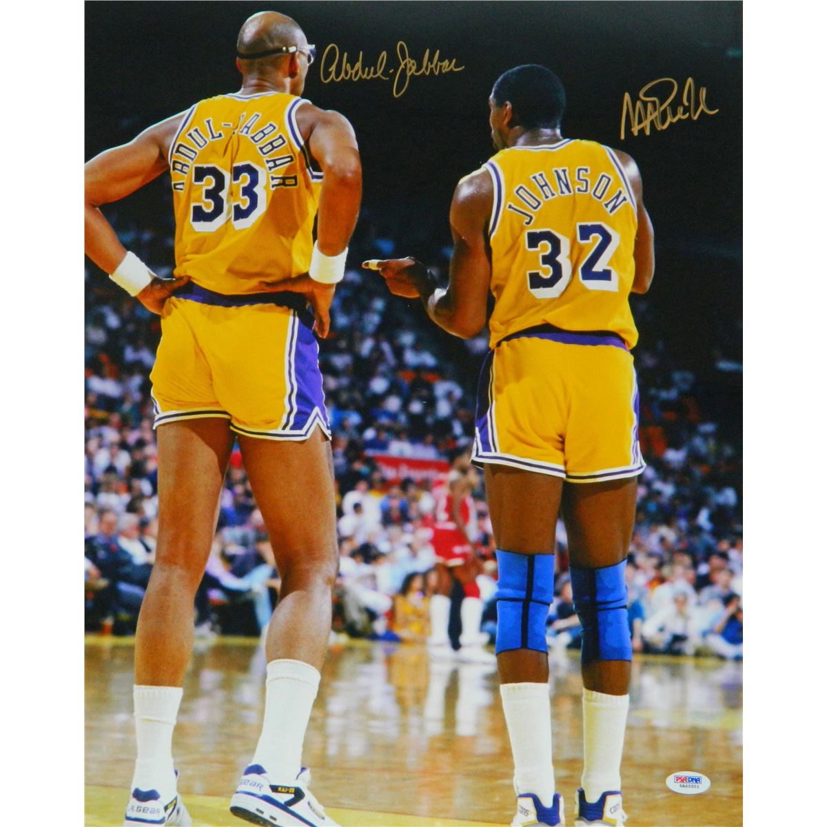 Kareem Abdul-Jabbar and Magic Johnson dual signed Los Angeles Lakers back of jerseys 16x20 photo. Item comes with a PSA/DNA tamper evident numbered sticker and matching Certificate of Authenticity for the Magic Johnson autograph and a Schwartz Sports Memorabilia numbered tamper-proof hologram and Certificate of Authenticity for the Kareem Abdul-Jabbar autograph. Both holograms can be verified online.