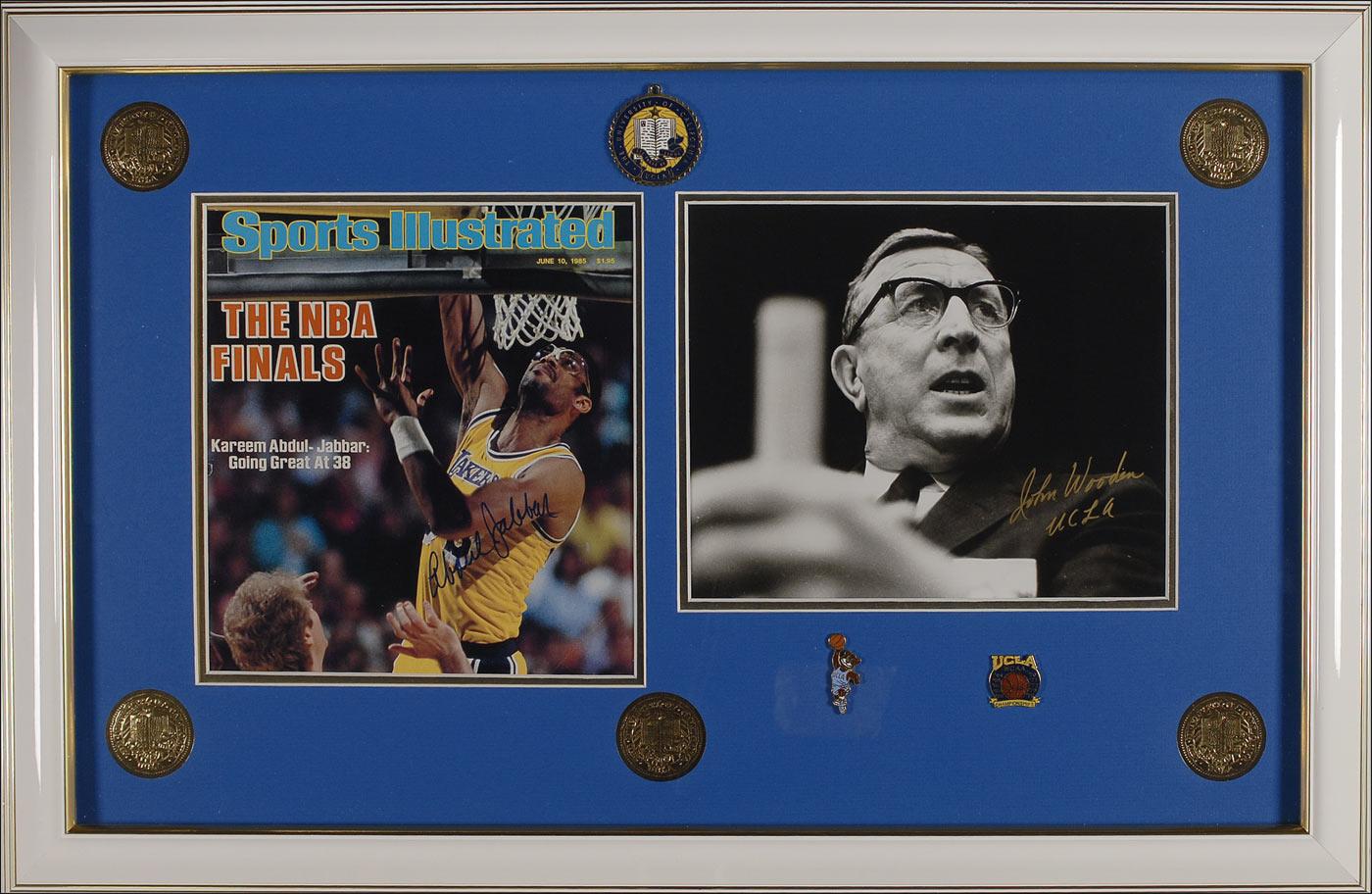 Two items: Sports Illustrated magazine cover, dated June 10, 1985, signed in blue felt tip, “Abdul Jabbar,” and a glossy 10 x 8 photo of Wooden from his coaching days, signed in gold ink, “John Wooden UCLA.” Both are double matted and framed together with two UCLA pins, a UCLA medallion, and several gold foil seals to an overall size of 25.5 x 17. In fine condition, with a couple creases to magazine cover. Accompanied by an unsigned July/August 2010 issue of Bruin Blue. Oversized.