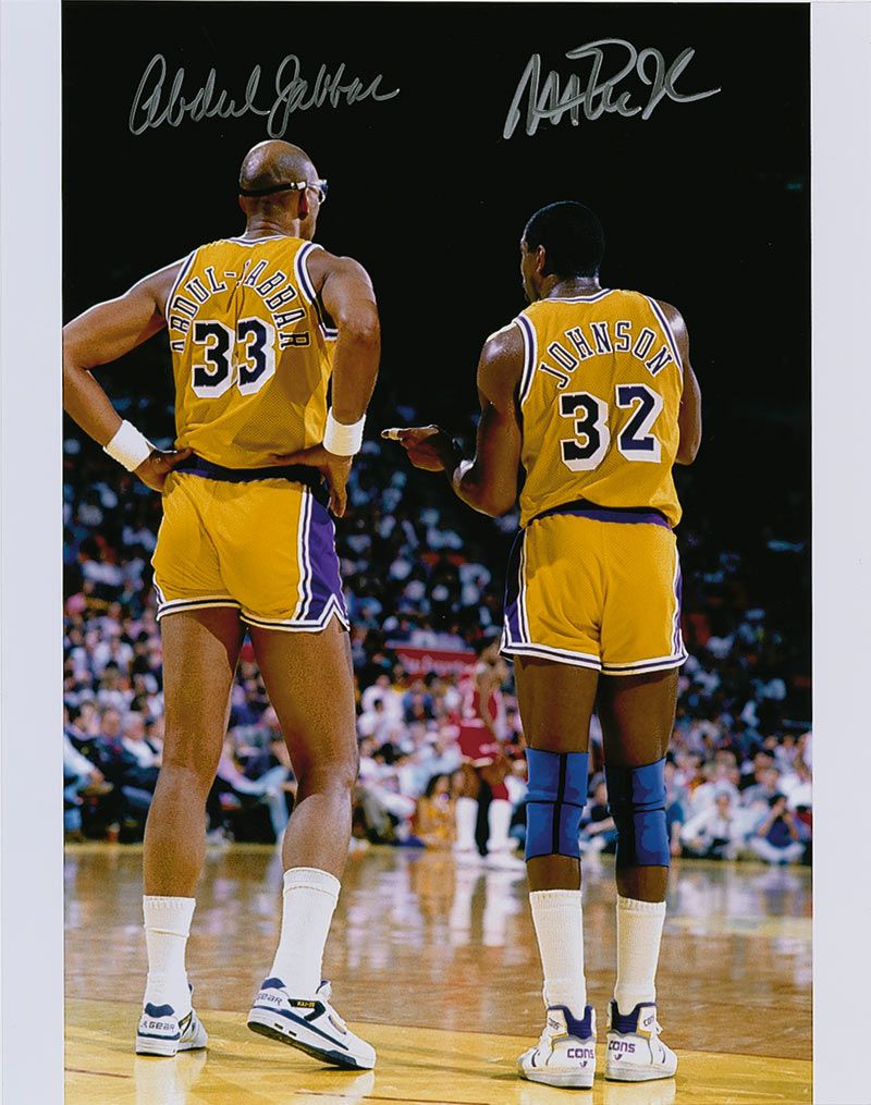 Color satin-finish 11 x 14 photo of the two Hall of Famers on the court for the Lakers, signed in silver ink, “Abdul Jabbar,” and “Magic Johnson.” In very fine condition.