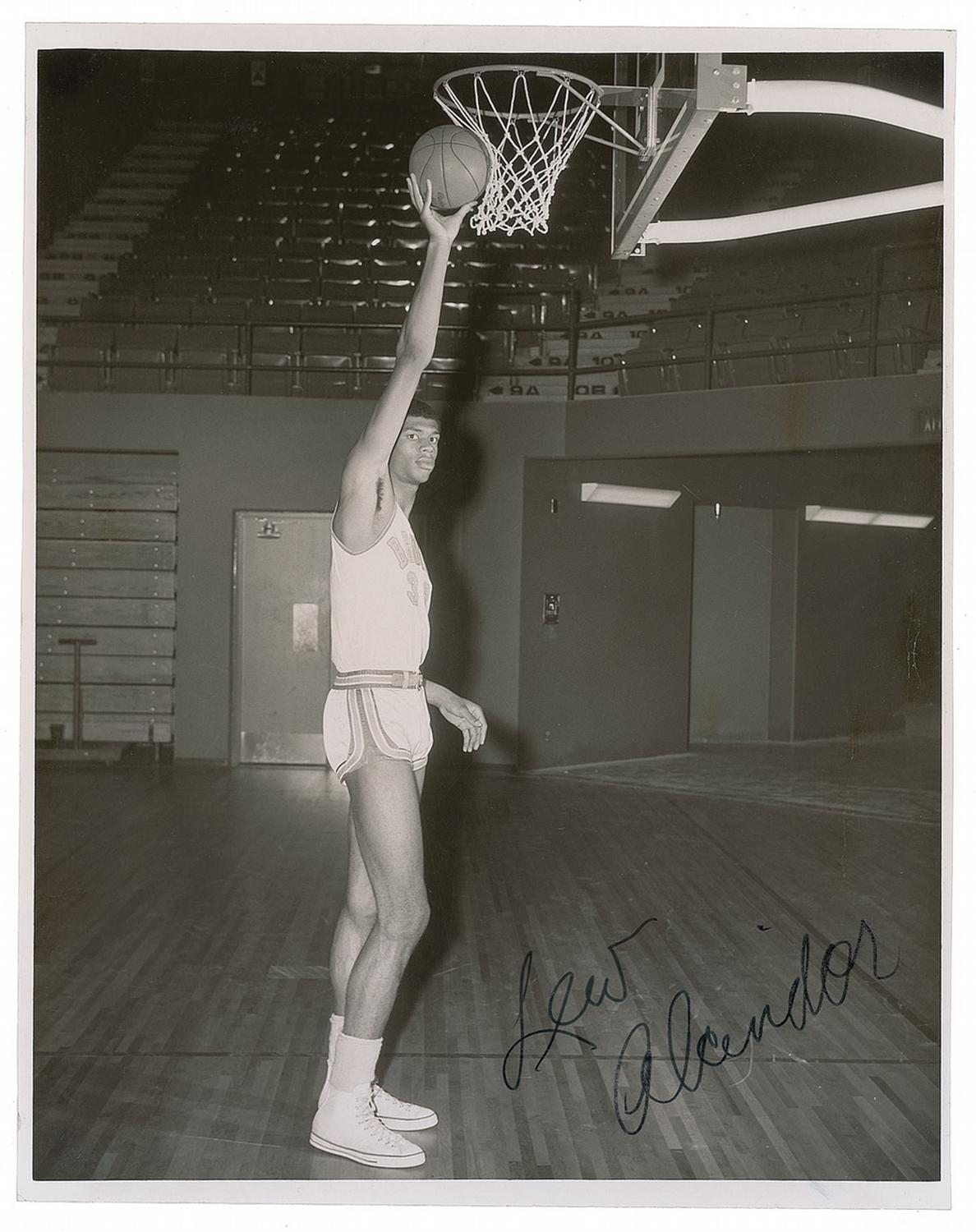 Basketball Hall of Famer who, during his 20-year career, scored more points than any other player in league history. Vintage glossy 8 x 10 photo of Abdul-Jabbar displaying his astonishing reach as a member of the UCLA Bruins, signed in black felt tip, “Lew Alcindor.” In fine condition, with scattered creasing and silvering to a few darker areas. Photos signed prior to his 1971 adoption of a Muslim name remain in high demand.