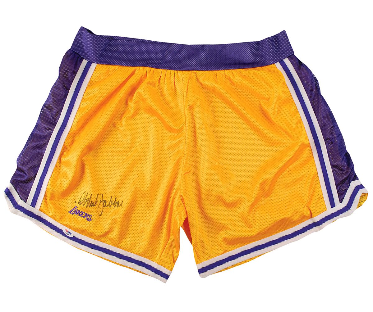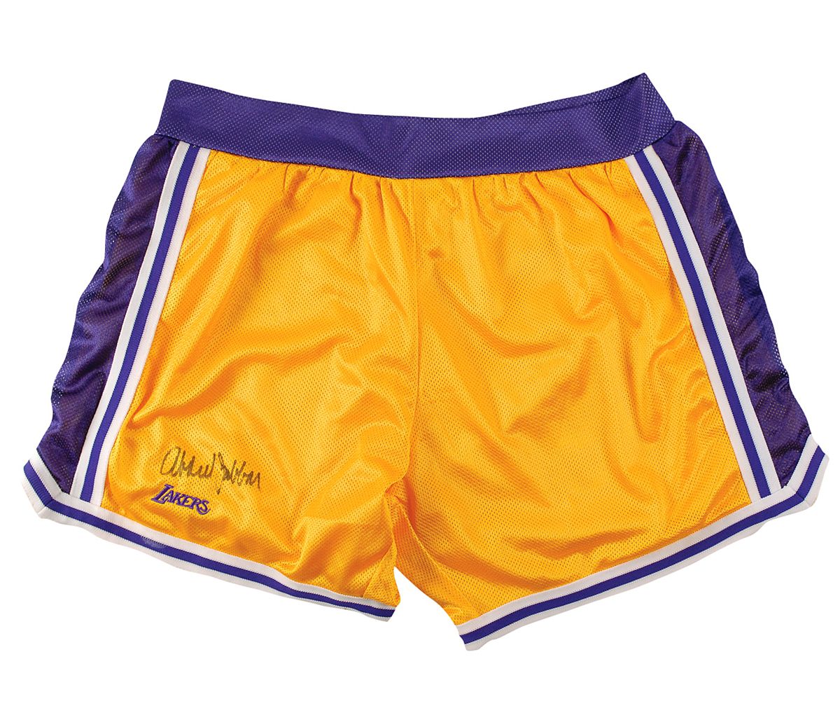 Two pairs of yellow, purple, and white Los Angeles Lakers Basketball shorts, each signed in black felt tip on the front. In fine condition. One pair is accompanied by a certificate of authenticity from PSA/DNA.