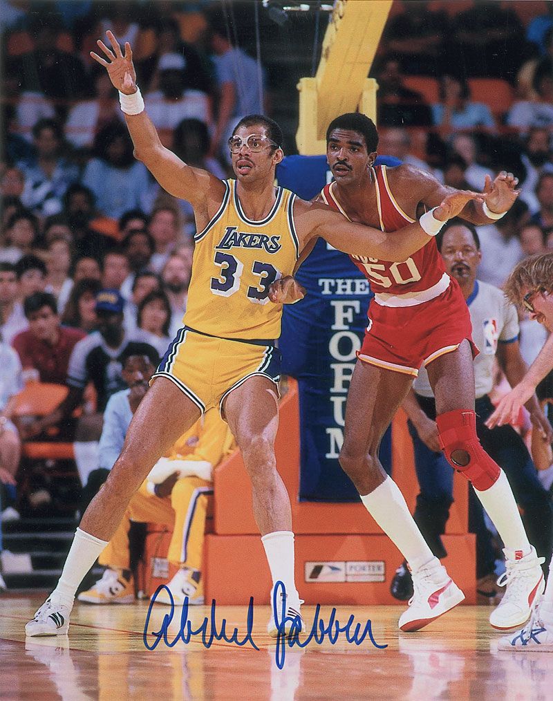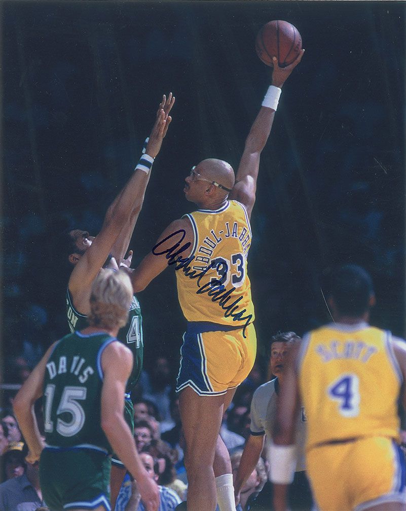 Two different color glossy 8 x 10 photos of Abdul-Jabbar on the court for the Los Angeles Lakers, each signed in blue felt tip, “Abdul Jabbar.” In very fine condition.