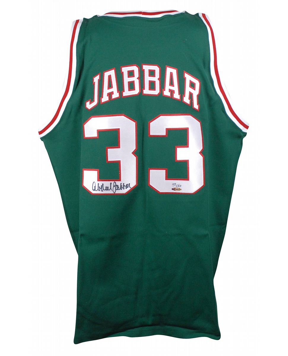 Official limited edition Mitchell & Ness Hardwood Classics replica Milwaukee Bucks basketball jersey, numbered 33/133, with sewn on letters and numbers, signed in black felt tip on the number on the back, “Abdul Jabbar.” In fine condition, with an Upper Deck authentication label affixed to the number. Accompanied by a certificate of authenticity from Upper Deck.
