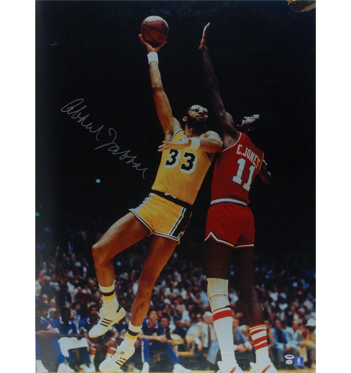 Great color satin-finish 30 x 40 photo of Abdul-Jabbar going up for one of his famous ‘skyhook’ shots, signed in silver ink, “Abdul Jabbar.” Rolled and in fine condition.