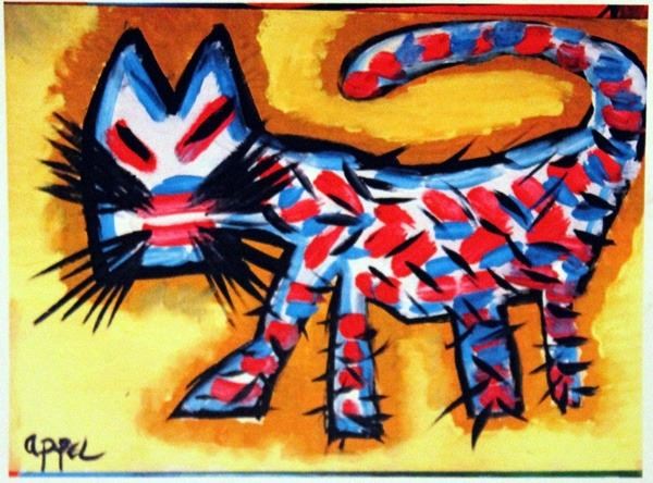 Oil on paper in the manner of Karel Appel, "The Cat", circa 1960, private collection, unframed dimensions are approximately 19x13. in the manner of Karel Appel, (born April 25, 1921, Amsterdam, Neth.—died May 3, 2006, Zürich, Switz.) Dutch painter of turbulent, colourful, and semiabstract compositions, who was a cofounder (1948) of the COBRA group of northern European Expressionists. He was also a noted sculptor and graphic artist. Appel first visited the United States in 1957, where he painted portraits of prominent jazz musicians, including Miles Davis and Dizzy Gillespie. His public works include a mural in the UNESCO building in Paris. His figurative sculptures in wood and metal share with the paintings a brutal, imaginative expressionism.