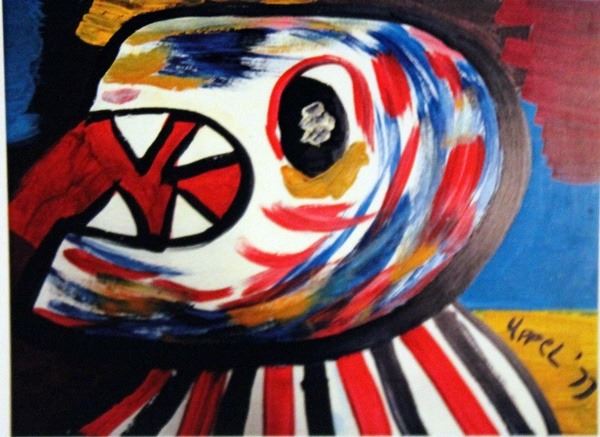 Oil on paper in the manner of Karel Appel, "The Dragon", circa 1977, private collection, unframed dimensions are approximately 16 1/2x 12. in the manner of Karel Appel, (born April 25, 1921, Amsterdam, Neth.—died May 3, 2006, Zürich, Switz.) Dutch painter of turbulent, colourful, and semiabstract compositions, who was a cofounder (1948) of the COBRA group of northern European Expressionists. He was also a noted sculptor and graphic artist. Appel first visited the United States in 1957, where he painted portraits of prominent jazz musicians, including Miles Davis and Dizzy Gillespie. His public works include a mural in the UNESCO building in Paris. His figurative sculptures in wood and metal share with the paintings a brutal, imaginative expressionism.
