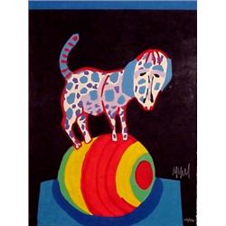 CIRCUS SUITE #28 (Dog on Ball), color carborumdum gravure, signed in pencil, the numbered edition 130, sheet 30 x 22 1/4", published by Editions ABCD, Paris. $1500/2000
