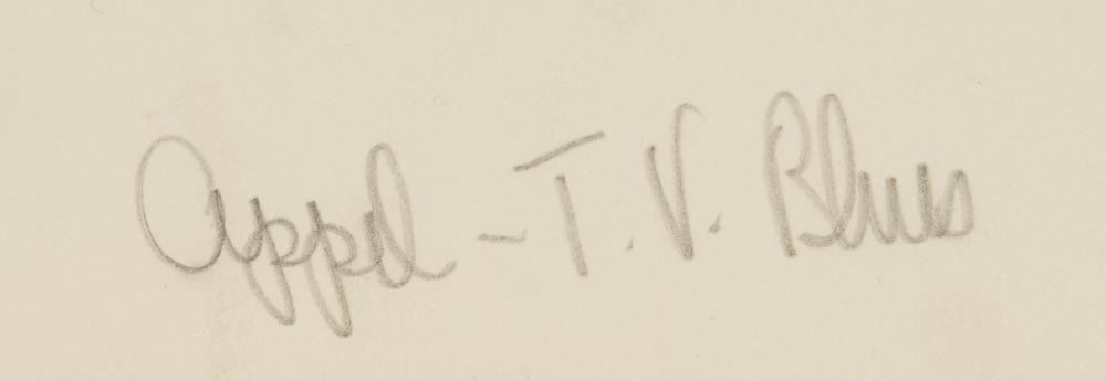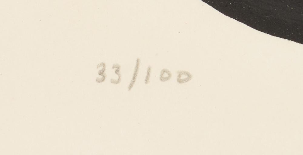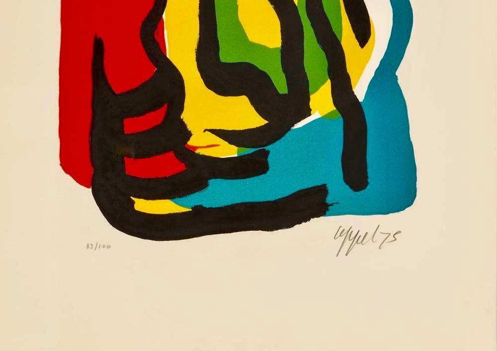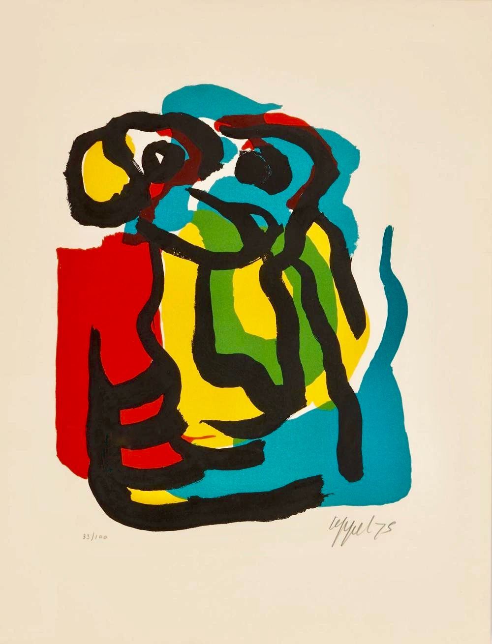 Karel Appel (1921-2006) Color lithograph on Arches paper titled "T.V. Blues" depicting an abstract multicolor human figure outlined in black. Numbered "33/100" in pencil, lower left under image, signed and dated "Appel 75" in pencil, lower right under image. Arches, France water mark, top right, Horn Edition, New York embossed watermark, lower right of sheet. Additional signature with title en verseo of sheet. Artist's CV, published and distributed by the London Arts Group. Sheet - 24 3/4" H x 20" W.