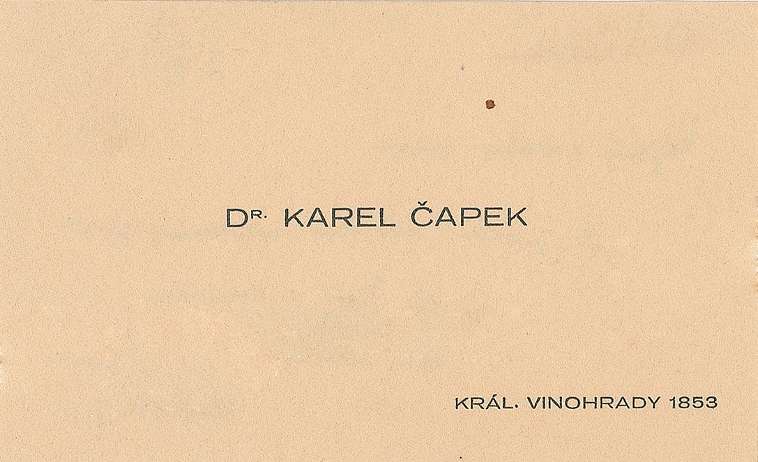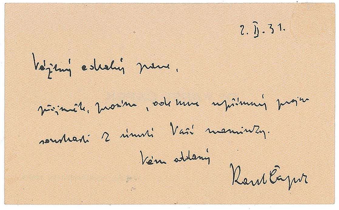 One of the most influential Czech writers of the 20th century who introduced and made popular the word ‘robot,’ which first appeared in his 1921 play R.U.R. (Rossum’s Universal Robots). ANS in Czech, one page on the reverse of his 4 x 2.5 visiting card, no date. Note of condolences. In full [translated]: “Please accept my deepest condolences on the death of your mom.” In fine condition.