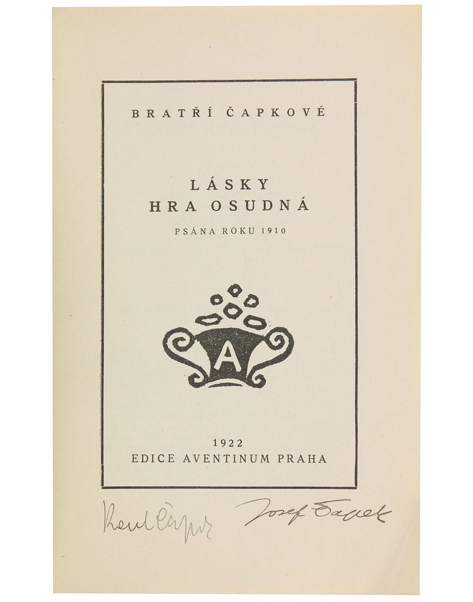 Signed book: Lasky Hra Osudna [Fateful Game of Love]. Prague: Aventinum, 1922. Softcover, 4.25 x 6.75, 48 pages. Signed on the title page in fountain pen by Karel Capek and his brother Josef Capek, a painter. In fine condition, with a light crease to one corner of the title page and creases and slight yellowing/discoloration to covers.