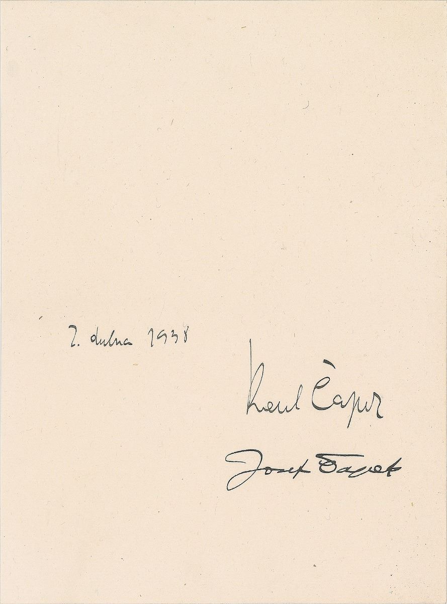 Brothers, Karel (1890–1938) was one of the most influential Czech writers of the 20th century who introduced and made popular the word ‘robot’; Josef (1887–1945) was a well-known painter and writer. Vintage fountain pen signatures of Karel and Josef Capek on an off-white 5.5 x 7.5 sheet dated 1938. In fine condition.