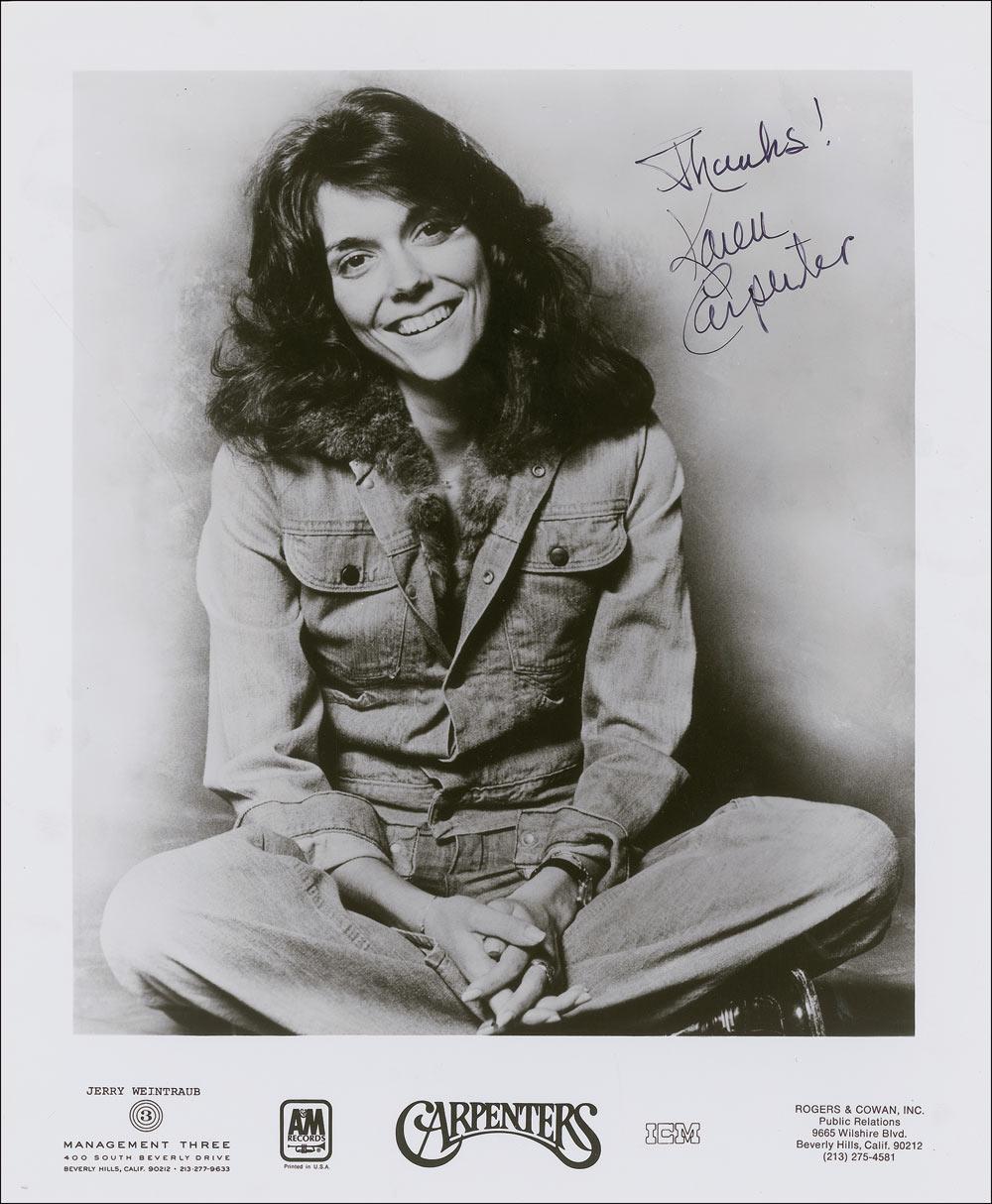 Glossy 8 x 10 A&M Records Carpenters promotional photo, signed in black felt tip, “Thanks! Karen Carpenter.” In fine condition, with a few scattered mild bends and creases. The first uninscribed Carpenter solo photo we have offered in years.