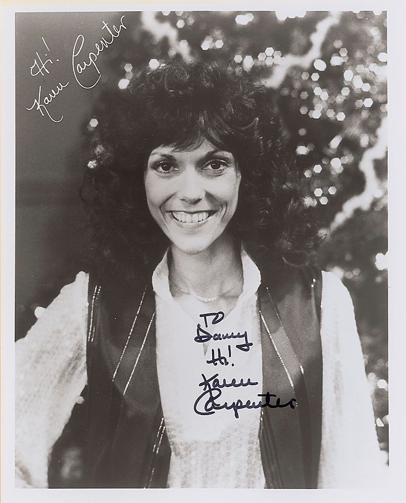 Scarce glossy 8 x 10 publicity photo of Carpenter, signed and inscribed in black felt tip, “To Danny, Hi! Karen Carpenter.” Photo also bears a pre-printed signature. In fine condition, with a trivial band of toning to the upper border.