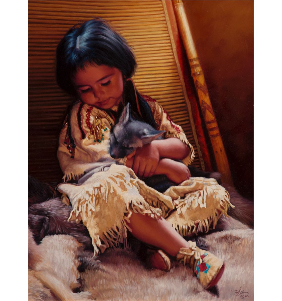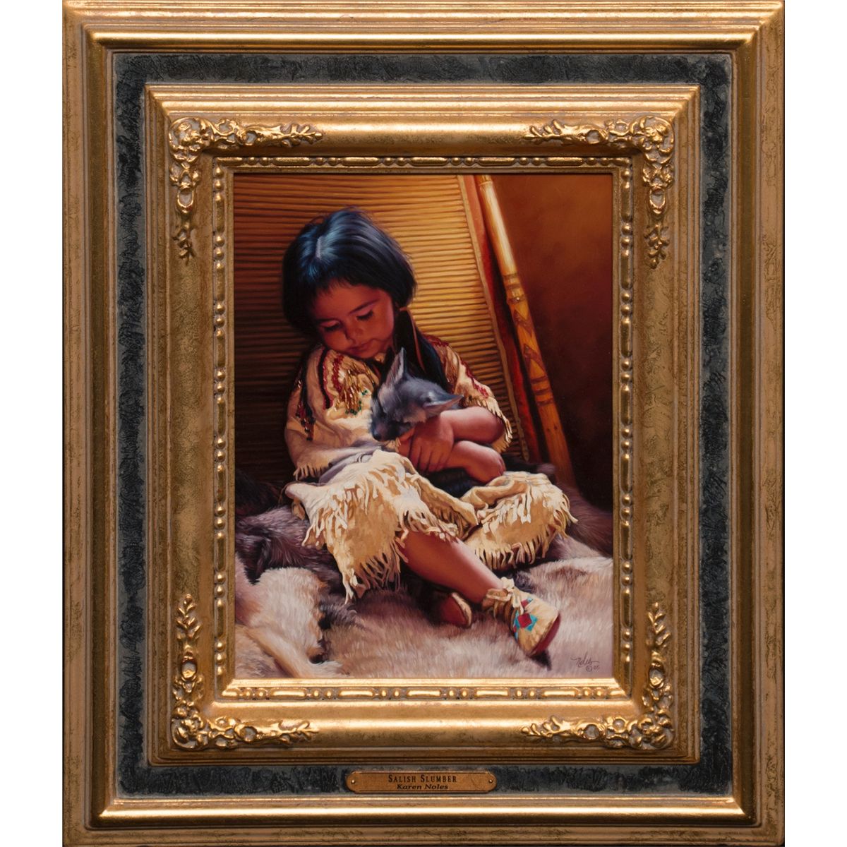 Karen Noles (1947 - ). Salish Slumber. 12" x 9" oil on canvas. Signed lower right: Noles © 05. Artist notation verso: Salish Serenity © 2005 Karen Noles. Young Salish girl holding a little fox kit and wearing an old authentic beaded buckskin dress handed down to her by her Great Great Grandmother. The model is from the Flathead Indian Reservation in Montana. Provenance: Estate of Ken Holm, Denver, CO.