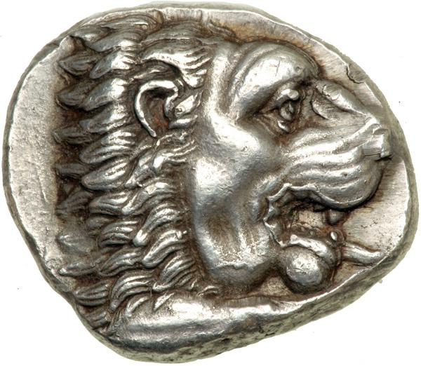 Karia, Knidos, c. 404-395 BC. AR Tetradrachm (15.27 g). Head and foreleg right of lion; tongue protruding. Reverse: Head right of Aphrodite wearing ampyx and sphendone within incuse; to left, bunch of grapes. Hecatomnus p. 120, pl. 13, A (this coin); cf. Cahn (Knidos) 120 (drachm). Apparently unique as tetradrachm! Dark toned in devices and struck with great care and strength.
