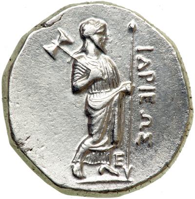 Built about 350 B.C., within a few years of when this coin was minted, the great tomb of Mausolos was erected by his sister-wife, Artemisia. This mausoleum was later to become one of the original Seven Wonders of the Ancient World.