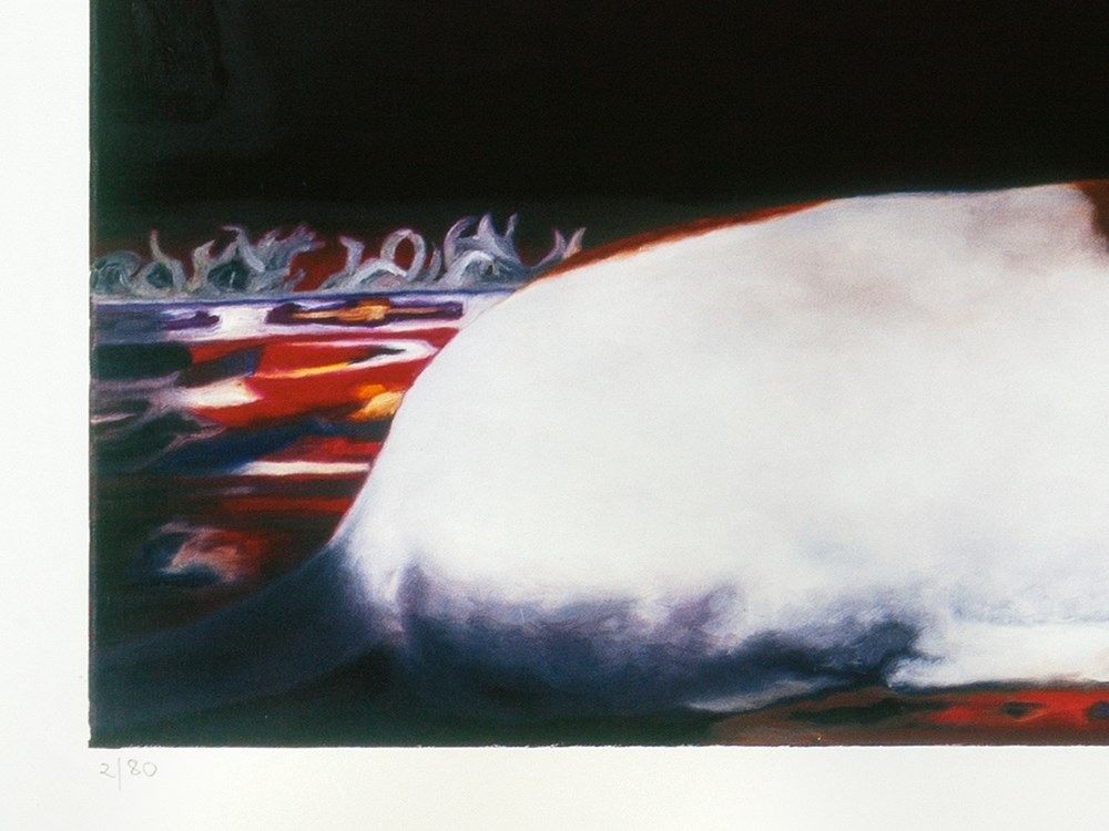 The offset lithograph is signed and dated with pencil lower right ‘Karin Kneffel 2003’ and numbered with pencil lower left ‘2/80’. The surface of the print shows very light traces of touching and a few faint handling creases. The depiction measures 87 x 58.5 cm and the dimensions of the sheet are 98 x 67 cm. The framed work measures 113 x 81 cm.