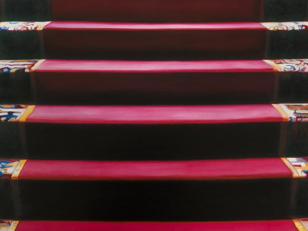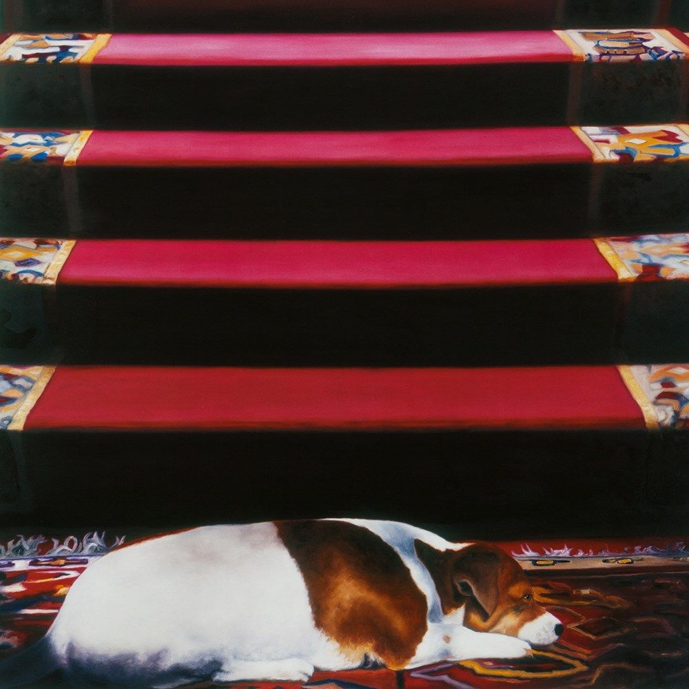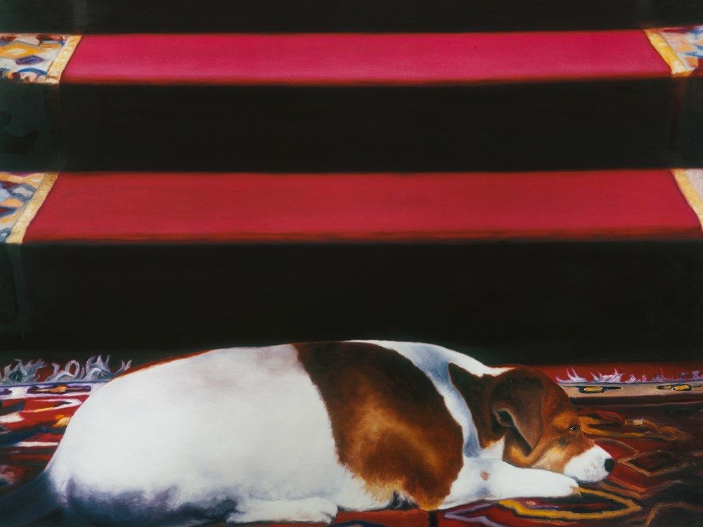 Karin Kneffel is interested in the depiction of motifs of unusual scale and perspective. Accordingly, the spectator may find colorful patterns of carpets, soft desserts or even sections of interiors reflected in the freshly waxed parquet floor. The present work shows the view on a staircase from below, so that the surrounding interior is completely left out. A dozy dog lies at the foot of the staircase and renders the scenery a funny touch.