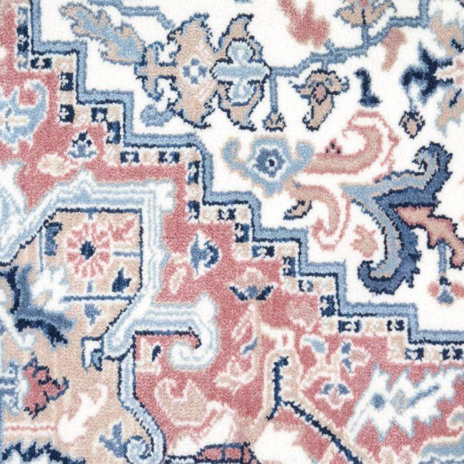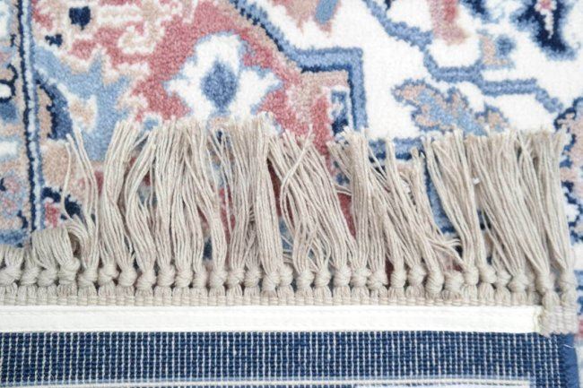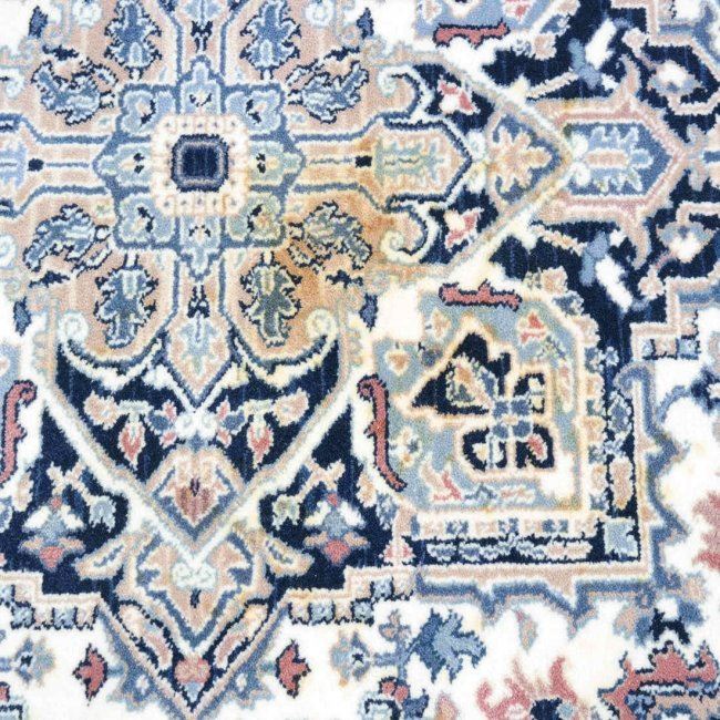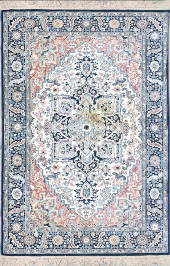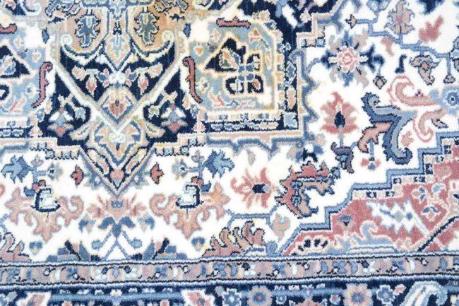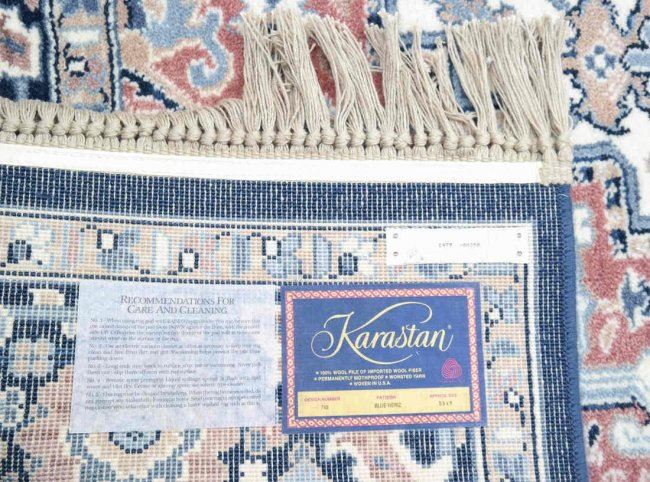 Karastan rug "Blue Heriz" pattern with original label. [Approx: 111" x 68"]. Stained center of rug.