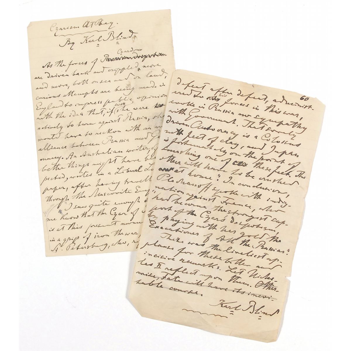 German revolutionist and writer on politics, history, mythology, and German literature (1826–1907). Rare and lengthy AMS in English, signed within the title and at the conclusion, 60 lined pages, 5 x 8, no date but circa autumn 1904. Blind’s draft for an article published in the North American Review in October of 1904, titled at the top, “Czarism at Bay, By Karl Blind.” In part: "As the forces of Czardom are driven back and crippled more and more, both on sea and on land, curious attempts are being made in England to impress public opinion with the idea that, if ever she were actively to turn against Russia, she would have to reckon with an armed alliance between Russia and Germany. An Australian writer…writes in a Liberal London paper, after having travelled through the Muscovite Empire: ‘I saw quite enough to make me know that the Czar of Russia is at this present moment holding in a grip of iron the war party in St. Petersburg, who, rightly or wrongly, imagine that Britain’s present Government intrigued successfully with the powers at Tokio to bring about the present war between Russia and Japan.’” Heavily hand-edited and revised throughout in ink and pencil, with several redacted sections. In fine condition, with small edge tears and expected wear. Accompanied by a photocopy of the final article as it was published in the North American Review. Blind was writing as a wave of social and political unrest was spreading through the Russian Empire, which led to a revolution beginning in January 1905, characterized by worker strikes, peasant unrest, and military mutinies. Despite changes in the structure of government, Nicholas II retained the throne, not to be forced to abdicate until the Bolshevik overthrow in 1917.