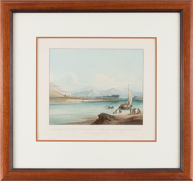 Karl Bodmer (1809-1893). Tab 38. Camp of the Gros Ventres on the Prairie. 14" x 16" hand-colored engraving. First edition, third state, 1839. Museum framed.