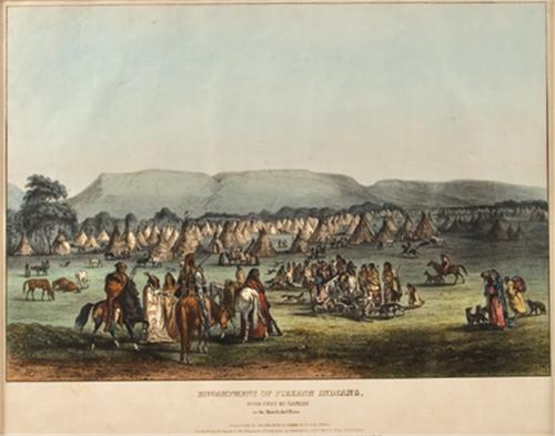 Karl Bodmer (1809-1893). "Encampment of Piekann Indians Near Fort McKenzie". 13 5/8" x 17 3/8" hand-colored lithograph. From the McKenney & Hall's "History of the Indian Tribes of North America" published by subscription 1836-44, vol 3. (est $2,000-3,000)