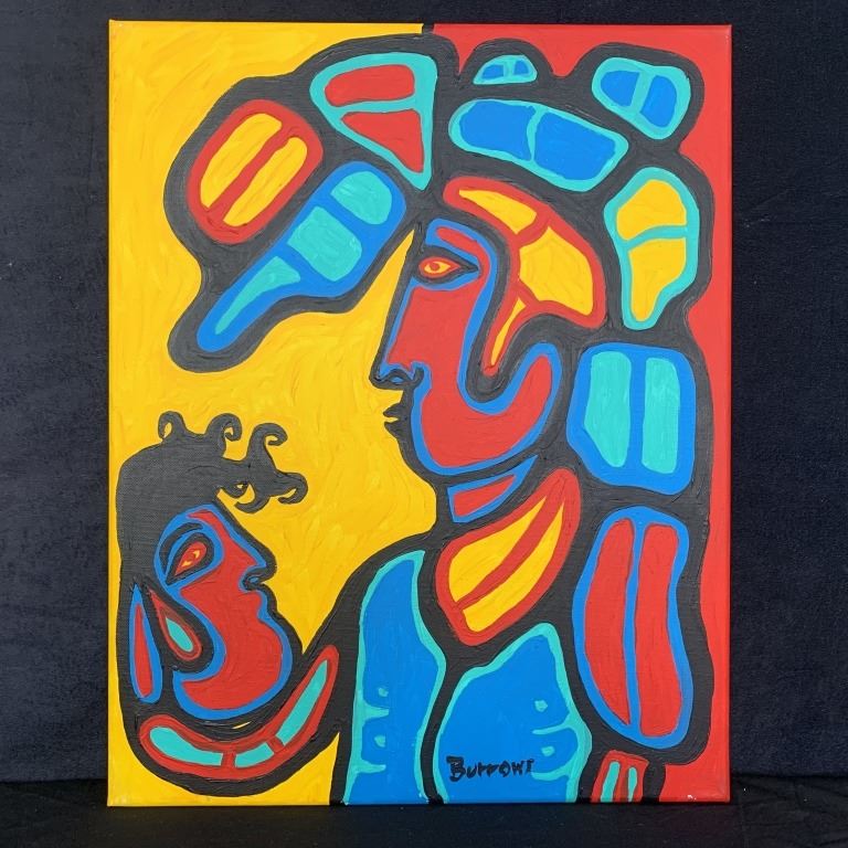 Karl Burrows' "Shaman and Spirit" original acrylic on canvas painting, signed lower middle. This piece is of a Shaman, speaking to a spirit head, done in Burrows' signature Aboriginal style. This painting is in excellent condition and has been professionally stretched over a stretcher board.