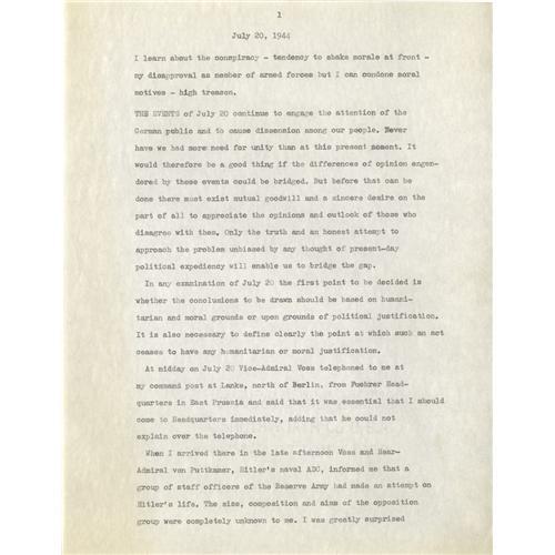 <B> Karl Donitz Reflects on Attempted Assassination of Hitler</B></I> Historically Important Typed Manuscript Signed: <I>"Donitz",</B></I> 7p, 8.5" x 11", separate sheets. Headed "July 20, 1944". On July 20, 1944, a group of staff officers made an attempt on Hitler's life. After the war, Grosadmiral of the Navy Karl Donitz, named by Hitler as his successor as Fuhrer, was indicted, tried, convicted and sentenced to ten years in prison. While at Spandau Prison (1946-1956), Donitz wrote the original of what is offered here. In part: <I>"The events of July 20 continue to engage the attention of the German people and to cause dissension among our people...At midday on July 20 Vice-Admiral Voss telephoned to me at my command post at Lanke, north of Berlin, from Fuehrer Headquarters in East Prussia and said it was essential that I should come to Headquarters immediately, adding that he could not explain over the telephone. When I arrived there in the late afternoon Voss and Rear-Admiral von Puttkamer, Hitler's naval ADC, informed me that a group of staff officers of the Reserve Army had made an attempt on Hitler's life...My first reaction was one of incredulity that officers could bring themselves, in war time, to do such a thing...Germany was like a besieged fortress, hard put to it to keep its foes at bay. Any strife within the fortress itself could not but adversely affect and weaken its efforts against the besiegers outside. The front itself would probably collapse, and complete defeat would swiftly follow. Had the attempt on Hitler's life succeeded, civil war would inevitably have resulted. The conspirators could not count on any support worth mentioning among the troops in Germany itself, and without it they would not have seized and retained power. The masses of the people were still solidly behind Hitler. They had no inkling of those facts which were known to the opposition group and which caused them to take action...The various Party organizations would undoubtedly have taken up arms against the new Government, and internal chaos would have been the inevitable result...<B>During the war the Navy was less affected by Hitler's personal leadership than the Army. To him war at sea was something strange and sinister. In the later stages of the war he refrained from any intervention in naval affairs</B></I>...Nor did the Navy see or hear anything about the effects of Himmler's activities behind the eastern front and many other misdeeds, all, of which were most probably well known to a number of generals and their staff officers...As a result the officers and officials of the Navy, with but two exceptions, had had no connection either with the opposition group or with the planning and preparation of its plot...While, then, <B>I approve of the moral motive of the conspirators, particularly as they were aware of the mass murders that had been committed by the Hitler regime, I cannot help asking myself how I myself would have acted, had I known of the enormity of the crimes perpetrated by the National Socialist system</B></I>...Today there is no longer any doubt that the conspirators were gravely at fault in their expectations regarding political repercussions abroad...Had they succeeded in coming to power, they could have prevented neither defeat nor the consequences of defeat. What that defeat would have looked like, in comparison with that which overtook us in May 1945, is a completely open question. Most probably, however, a legend would have grown up that <B>our collapse had been caused solely by the act of teachery of the assassins and that the war could have been brought to a satisfactory conclusion if only Hitler had remained alive.</B></I> I believe that the emergence of such an idea would have torn the German people more fiercely asunder than does a difference of opinion on July 20 today...." </B></I>Karl Donitz, as Fuhrer, ordered the surrender of Germany forces on May 8, 1945, eight days after Hitler's death. Four of the pages are stained along the lower edge of the page. Else in very fine condition.