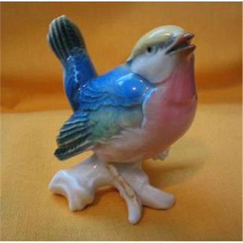This beautiful porcelain bird on a branch figurine was made by Karl Ens and marked: ENS/Germany, according to the Kovels New Dictionary of Marks-Volkstedt, Thuringia, Germany(E.Germany). The "Porzellanfabrik Karl Ens" was founded in 1890 and existed until 1972. The colors, blue, pink, yellow, green and grey are exquisitely done I really don't know what kind of bird he is, if anyone knows I would appreciate an email, and he measures 3 1/4 inches tall, 2 1/2 inches wide and 2 3/4 inches deep. A great addition to any Bird Figurine Collection and a plus for any Karl Ens Porcelain Collection.