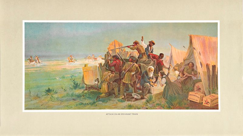 'Copyright By August A. Busch'l/l/; 'Attack on an Emigrant Train' l/c in margin; 'Anheuser Busch Companies Inc' l/r