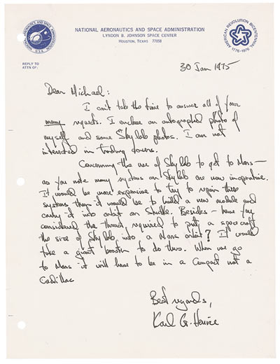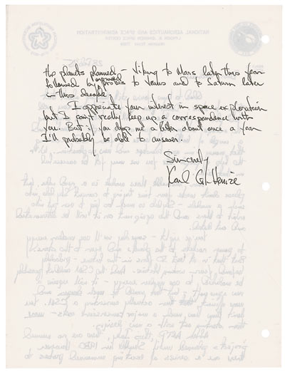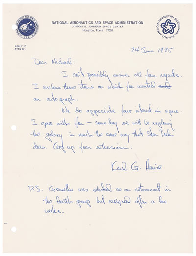 NASA astronaut and space scientist (1926–1993) who flew on STS-51-F. He died of high altitude pulmonary edema during a climb of Mount Everest. Three ALSs, two one-page and one one page, both-sides, all on NASA letterhead, all from 1975, all to the same recipient. One letter reads, in part: “Concerning the use of Skylab to get to Mars…have you considered the thrust required to put a spacecraft the size of Skylab into a Mars orbit? It would take a giant booster to do this. When we go to Mars it will have to be in a compact not a Cadillac.” Another letter closes with Henize stating “Someday we will be exploring the galaxy in much the same way that Star Trek does.” In fine condition, with punch holes to left edges.
