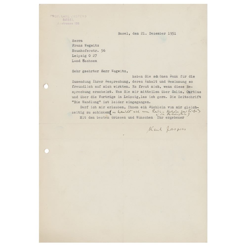 German psychiatrist and philosopher (1883–1969) who attempted to develop an innovative philosophical system. TLS in German, one page, 8.25 x 11.75, stamped personal letterhead, December 21, 1951. Letter to Franz Wegwitz, sending thanks for a pleasing review and informing him of the demise of the magazine 'Die Wandlung.' He adds a brief handwritten note concerning radio lectures for an introduction to philosophy. In fine condition.