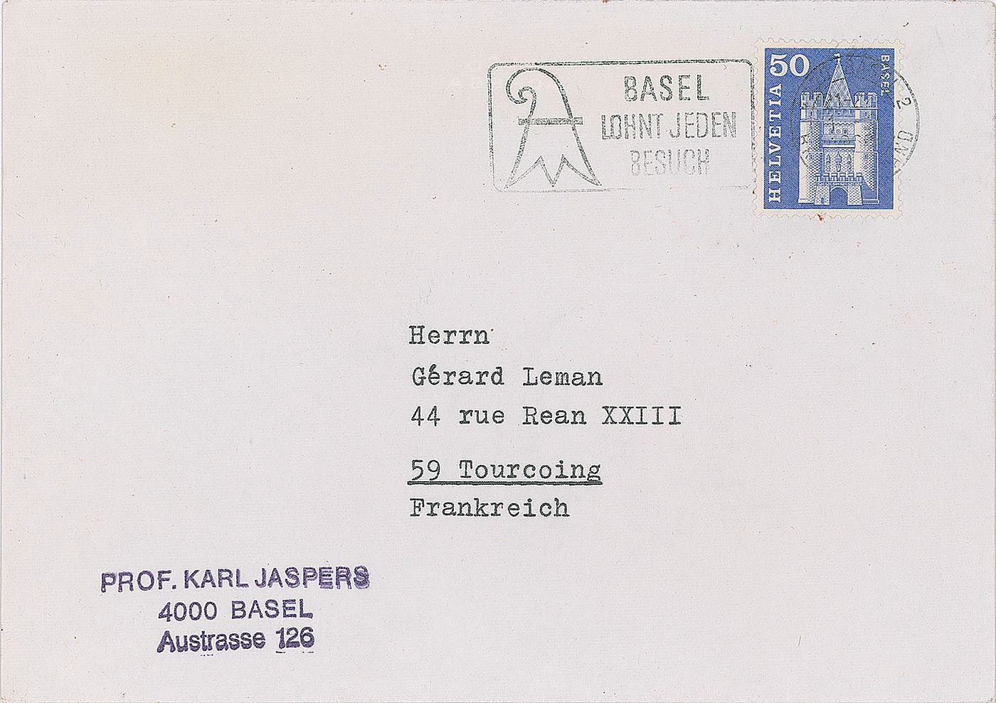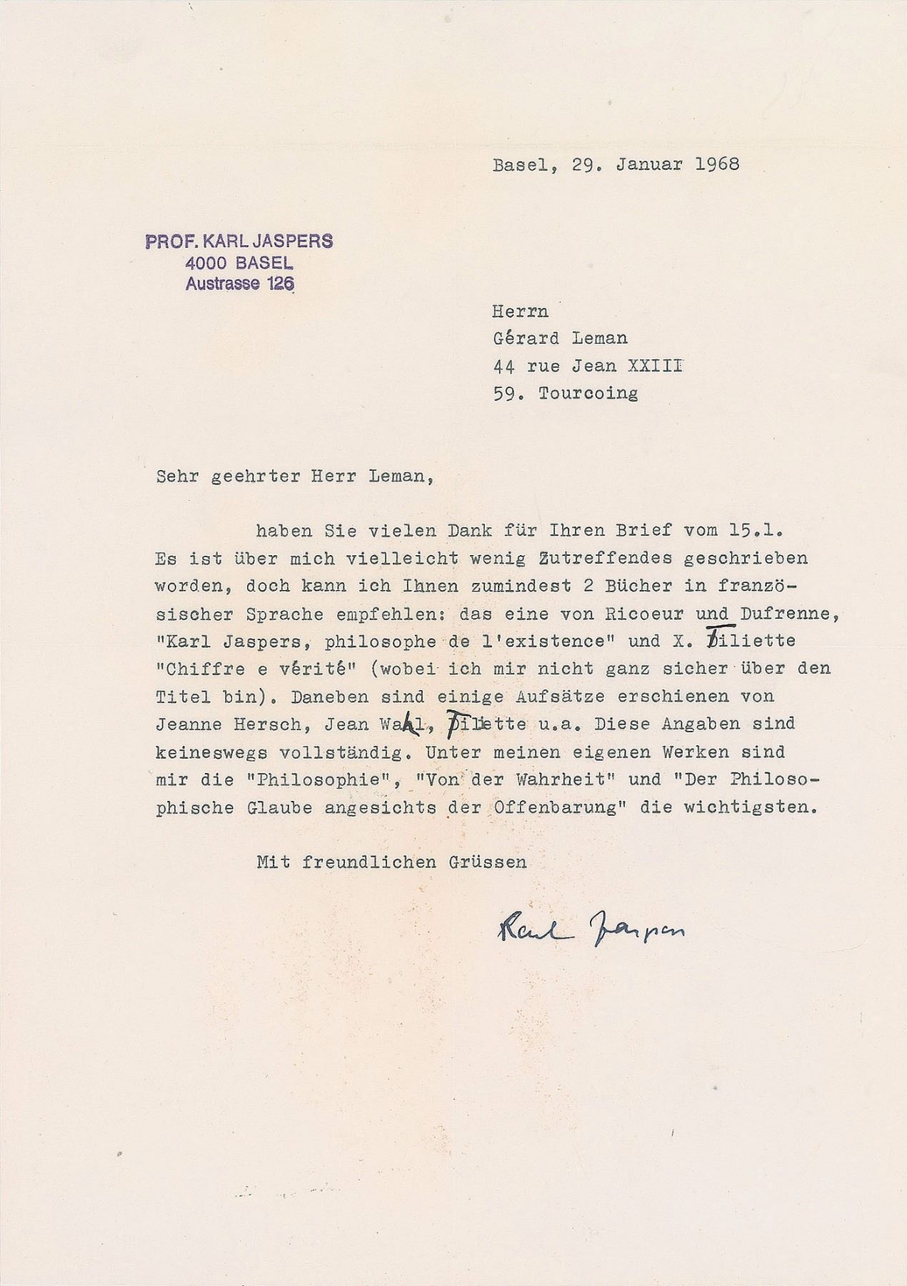 German psychiatrist and philosopher (1883–1969) who attempted to develop an innovative philosophical system. TLS in German, one page, 8.25 x 11.75, stamped personal letterhead, January 29, 1968. Letter to Gerard Leman, in part (translated): "It may not have been written well enough about me, but I can at least recommend you two books in French: the one by Ricoeur and Dufrenne, ‘Karl Jaspers, philosophe de l'existence’ and X. Tiliette, ‘Chiffre e vérité’ (although I am not sure about the title). In addition, some essays have been published by Jeanne Hersch, Jean Wahl, Tiliette et al. This information is by no means complete. Among my own works, the most important are ‘Philosophie,’ ‘Von der Wahrheit’ and ‘Der Philosophische Glaube angesichts der Offenbarung.’" In fine condition. Accompanied by the original mailing envelope.