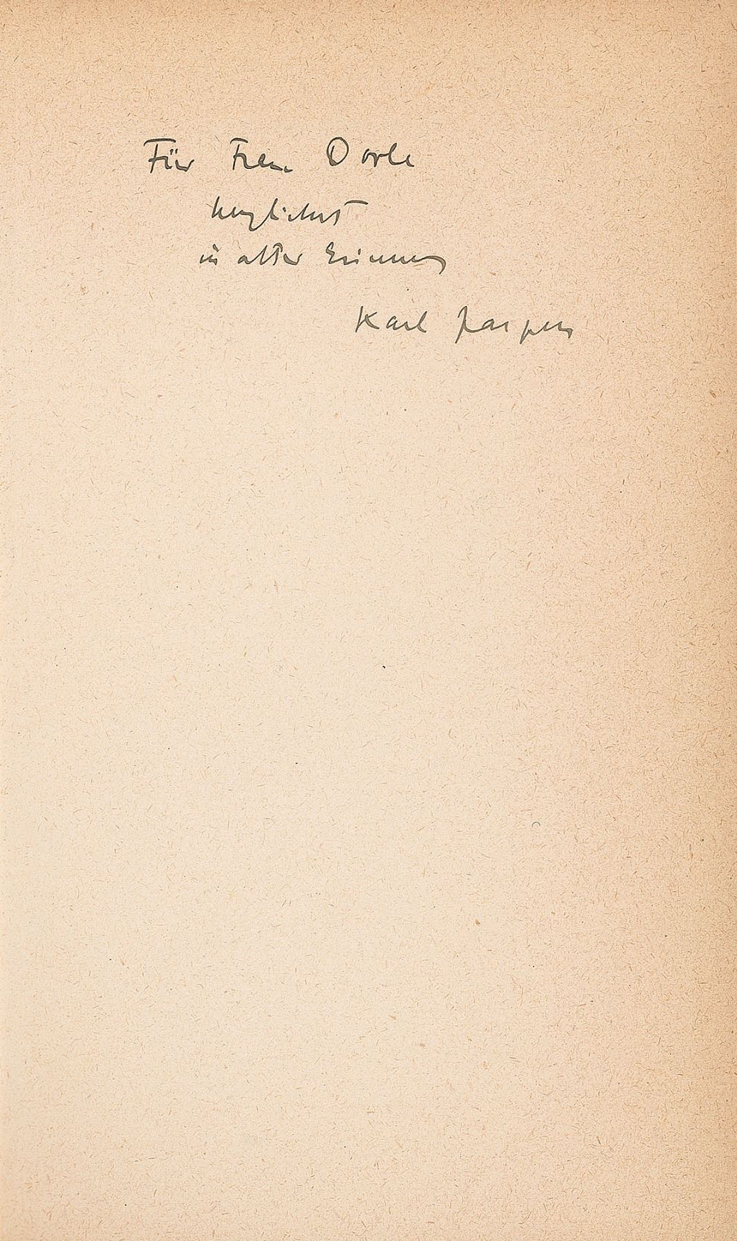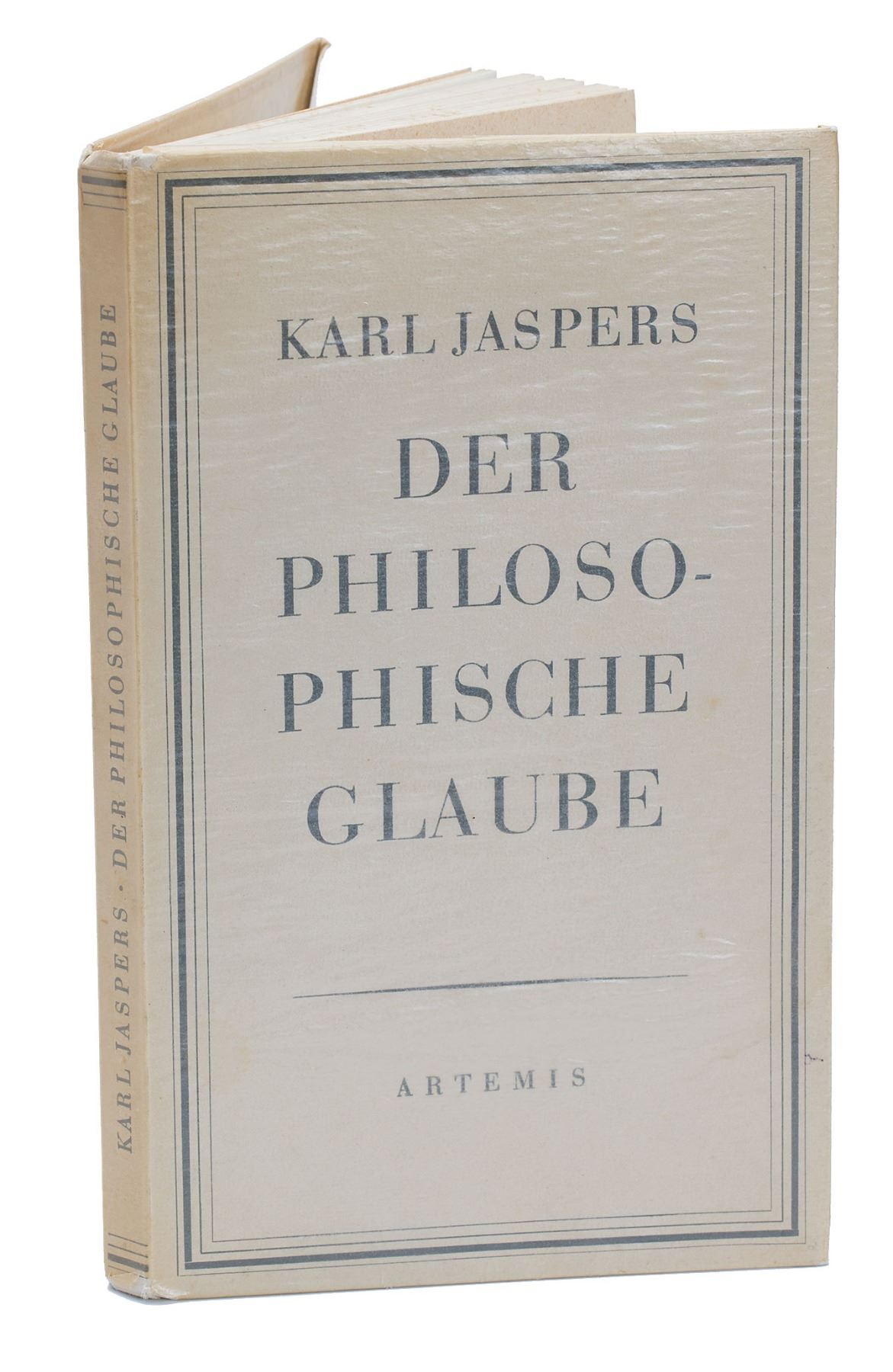 German psychiatrist and philosopher (1883-1969) who attempted to develop an innovative philosophical system. Signed book in German: Der Philosophische Glaube. Zurich, CH: Artemis, 1948. Softcover, 4.5 x 7.5, 158 pages. Signed and inscribed on the first free end page in black ink by Jaspers. In fine condition, with some light toning.