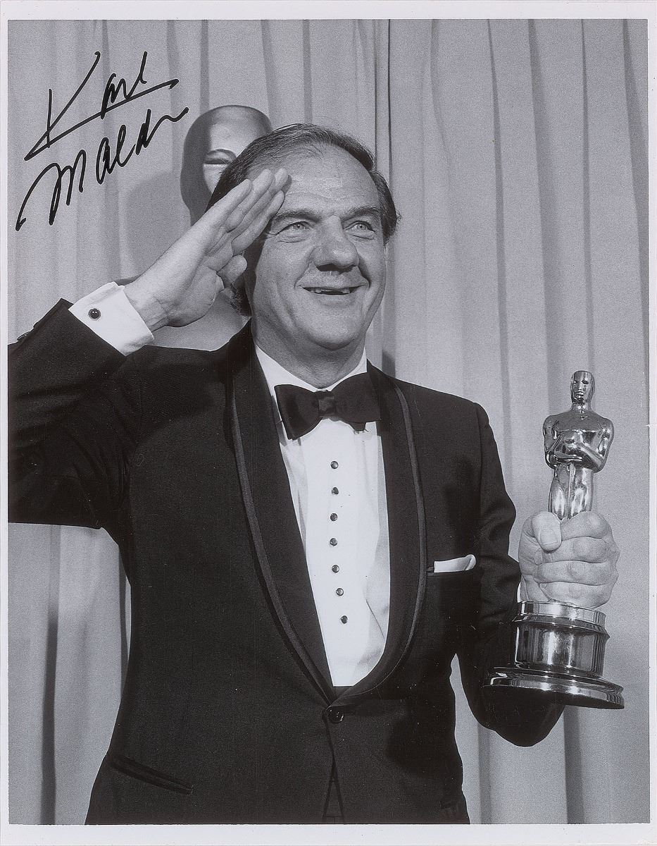 Uncommon glossy 7.75 x 10 half-length photo of Malden holding his Best Supporting Actor Oscar for his role as Mitch in the 1951 film A Streetcar Named Desire, signed in black felt tip. Reverse bears an AMPAS stamp. In fine condition, with trimmed borders, and a light vertical crease.