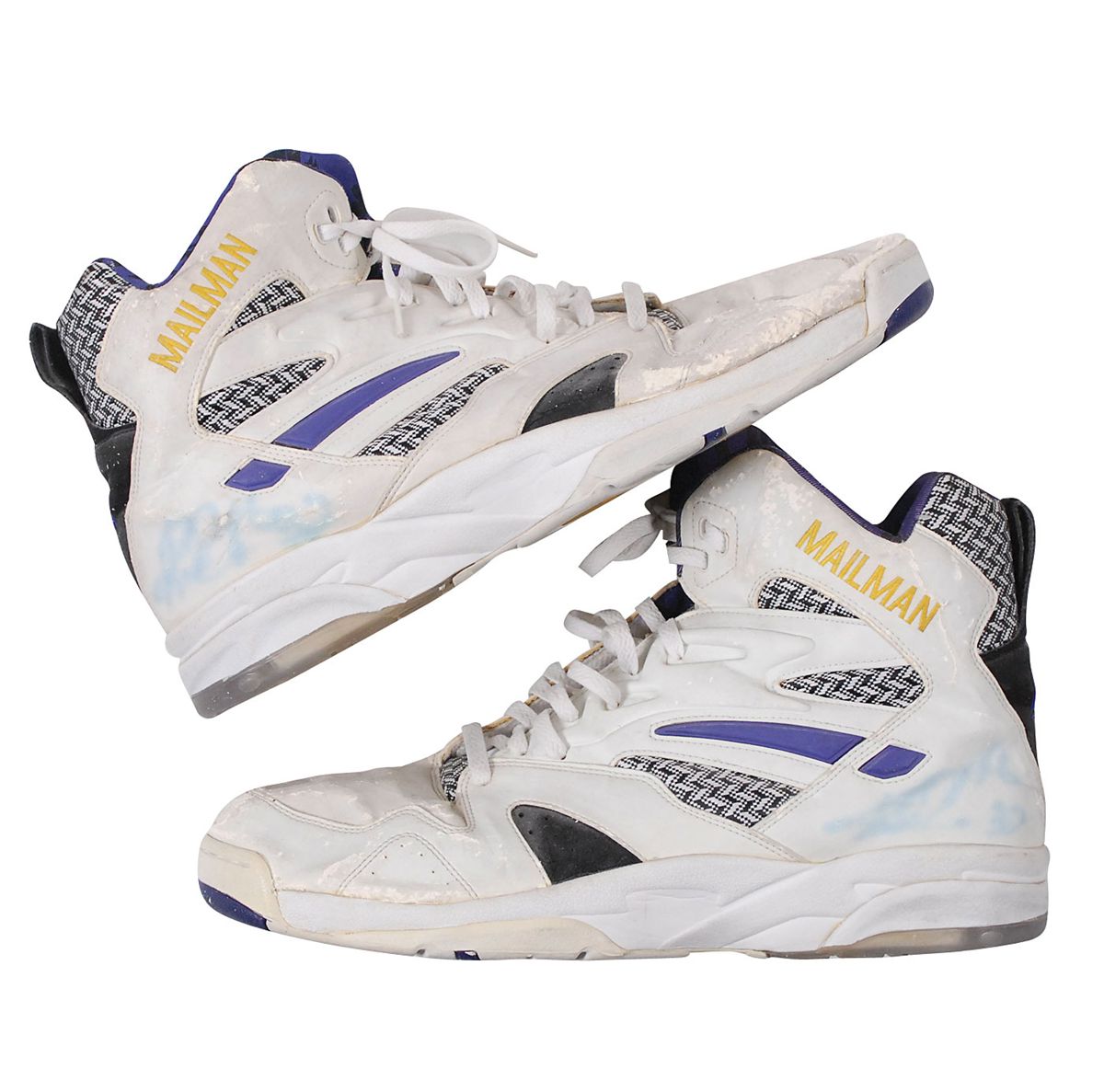 Malone’s official LA Gear ‘The Mailman’ game-used sneakers from the mid-to-late 1990s, size 16, each signed in blue felt tip near the heel. In very good condition, with heavy scuffs and cracks to shoe leather and the signatures significantly faded. Accompanied by a letter of provenance from Brian Sobrero which states that the shoes were obtained from Malone after the Utah Jazz played a road game against the Sacramento Kings.