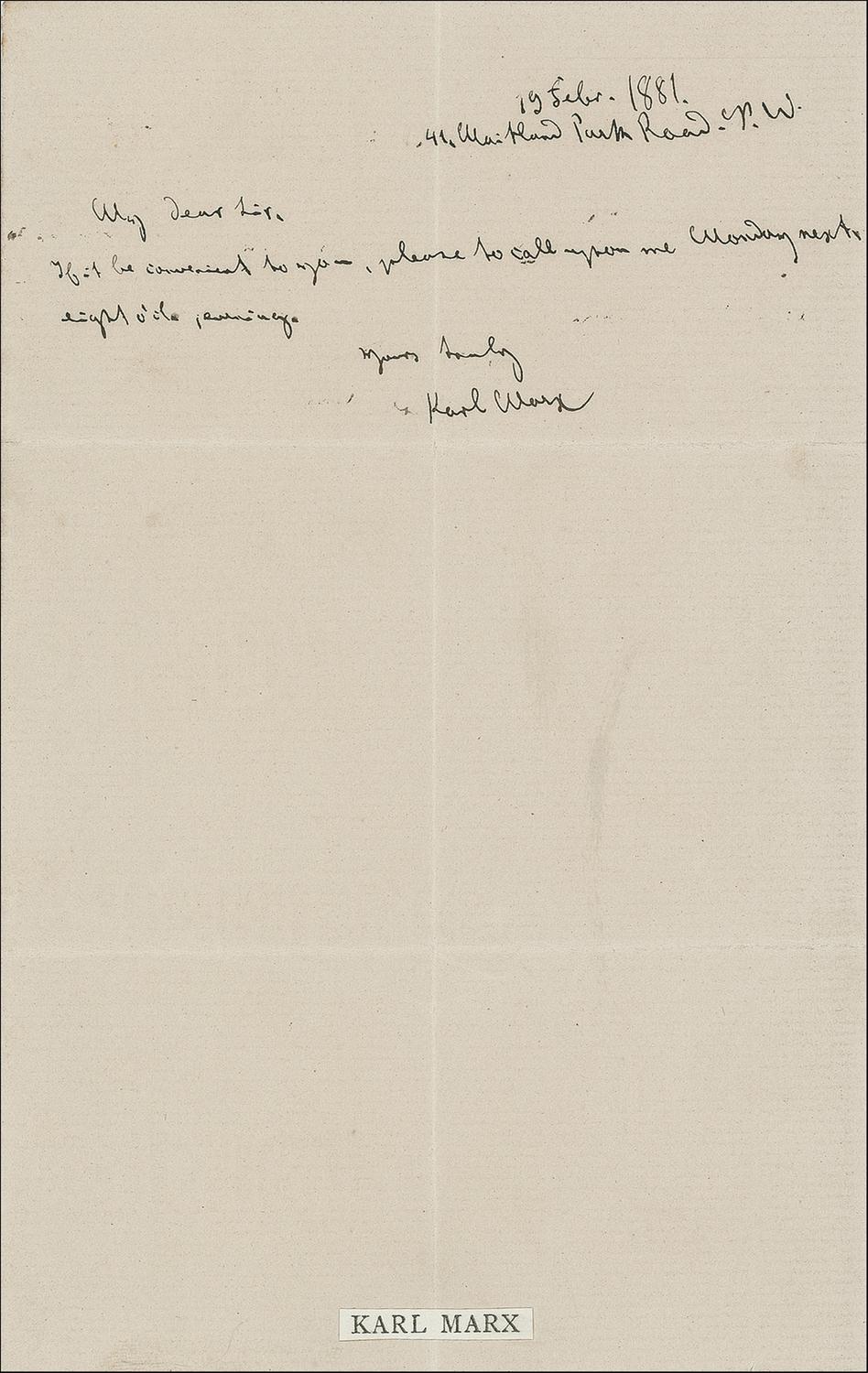 Highly important German philosopher, political theorist, and author (1818–1883) whose Communist Manifesto (1848) and Das Kapital (published 1867–1894) provided an ideological basis for communism and thus proved to be two of the most influential texts in the history of modern civilization. Rare and desirable ALS, one page, 4.5 x 7, February 19, 1881. Brief letter to an unidentified gentleman. In full: “If it be convenient to you, please to call upon me Monday next eight o’cl evening.” Intersecting folds, one through a single letter of the signature, and a small caption affixed to the extreme bottom edge, otherwise fine condition.