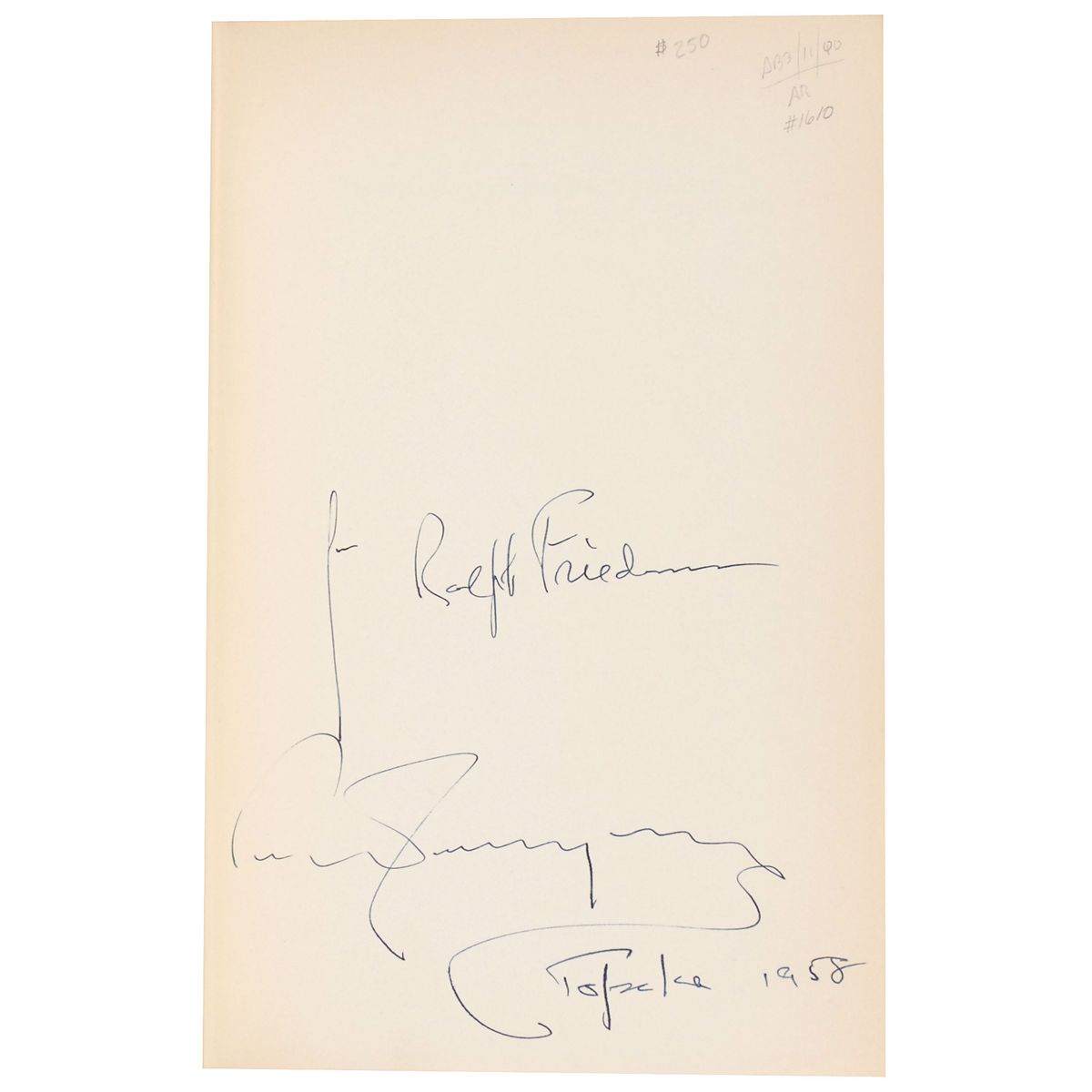 Each item in the catalog is described with a statement of opinion indicating its overall condition. The condition of the items we offer generally falls into the following range: good—very good—?ne—very ?ne. Treated as a scale of 1 to 4, good describes an item that has as many as several ?aws, which are described in detail; very fine describes an item whose condition and appearance may be regarded as ?awless and superior in every respect. Most of the items we offer are in ?ne condition, meaning that there are no serious ?aws. While we make every effort to describe ?aws that materially affect appearance and value, we generally do not specify minor or routine ?aws, such as (but not limited to) pencil or secretarial notations, mailing folds to letters, normal aging to paper, or tiny bends or creases from normal handling. We encourage prospective bidders to examine the image(s) of each item closely and to contact us with speci?c inquiries regarding condition.