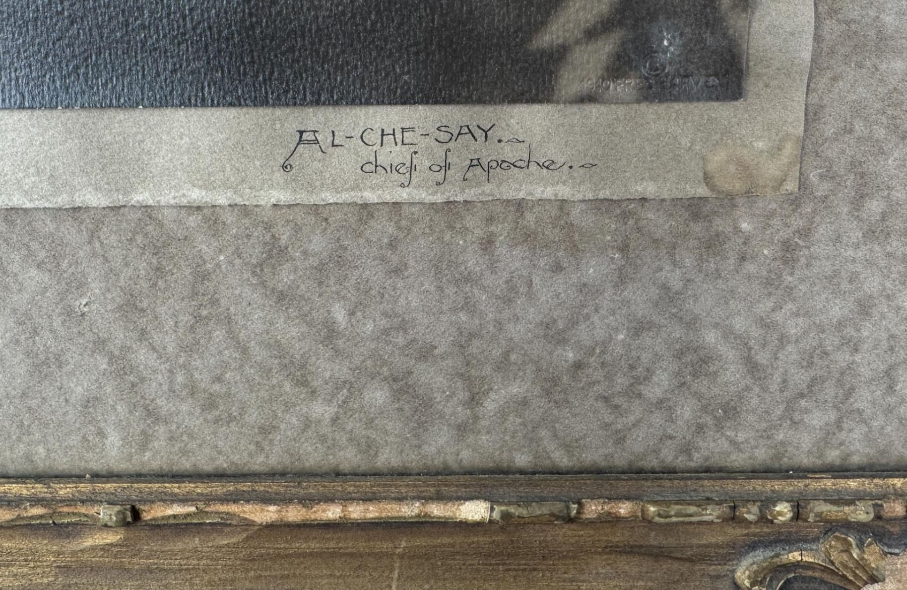 AL-Che-Say Chief of the Apache Indians. Large format Silver Gelatin Photo. Blind Stamped Fred Harvey in the corner. Wonderful old image in original frame. 21 1/2" by 25 1/4" framed.