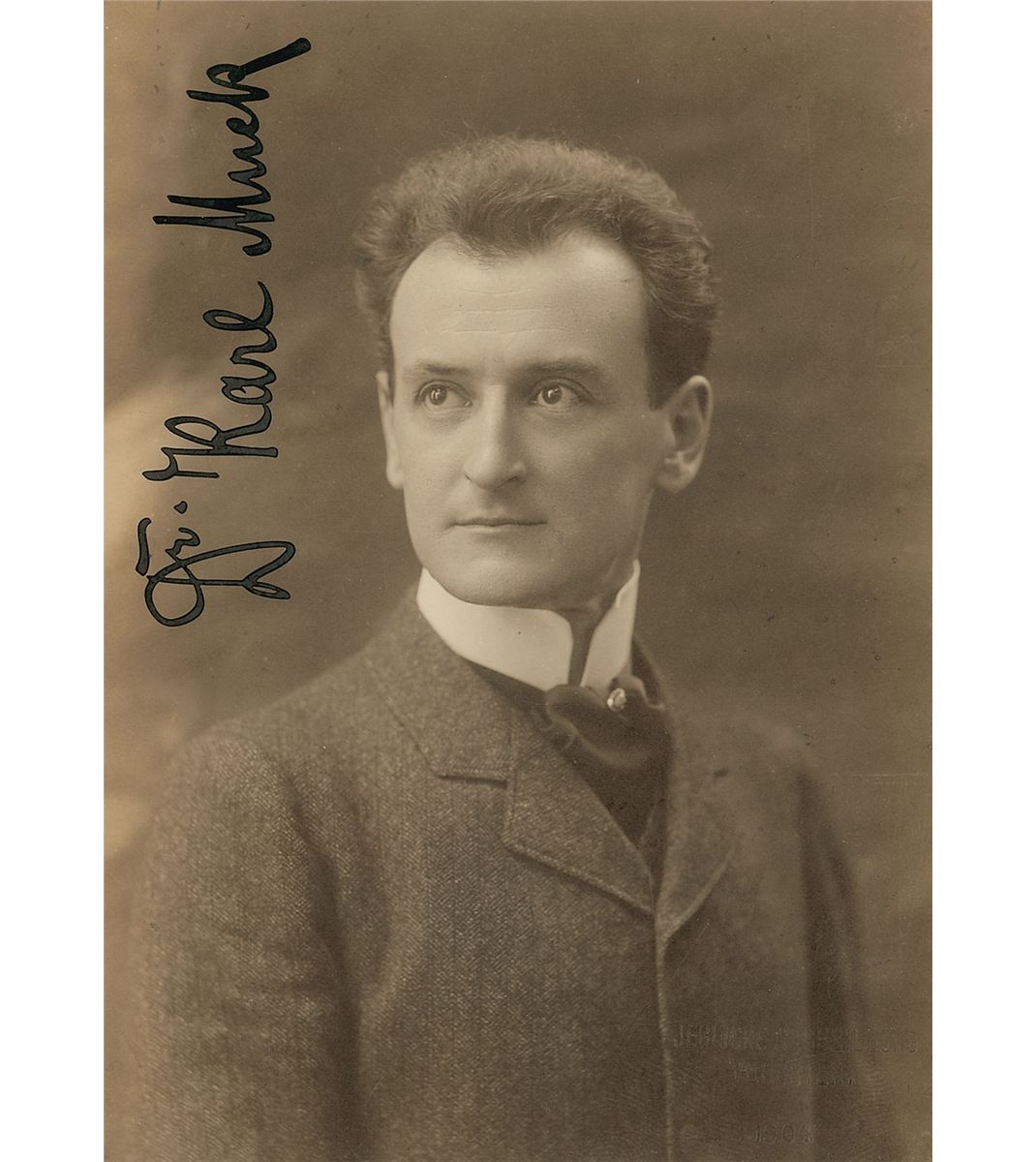 Classical conductor (1859–1940) who endured public scrutiny in 1917 as to his allegiance during World War I. Original 4.25 x 6.5 cabinet photo by F. O. Lundt of Berlin, signed vertically in black ink. In fine condition, with a 1904 photographer’s stamp to lower right, and a small area of surface loss to reverse corner.