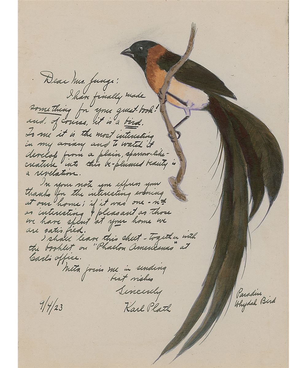 ALS, one page, 7.5 x 10, September 4, 1923. Letter to a gentleman. In part: “I have finally made something for your guest-book! and, of course, it is a bird. To me it is the most interesting in my aviary and to watch it develop from a plain, sparrow-like-creature into this be-plumed beauty is a revelation.” To the right of the text, Plath has added a gorgeous ink and watercolor depiction of the bird perched on a tree branch, labeled “Paradise Whydah Bird.” Affixed to a slightly larger sheet. In fine condition. Born in Chicago, Karl Plath made his mark on the art world with his extraordinary work on birds. After studying at the Academy of Fine Arts, he frequently exhibited around the country during the 1920s–1940s. He also served as the Curator of Birds at the Brookfield Zoo, traveled the world in search of rare specimens, and amassed his own aviary of hundreds of species. A stunning painting from the highly regarded ornithologist and artist.