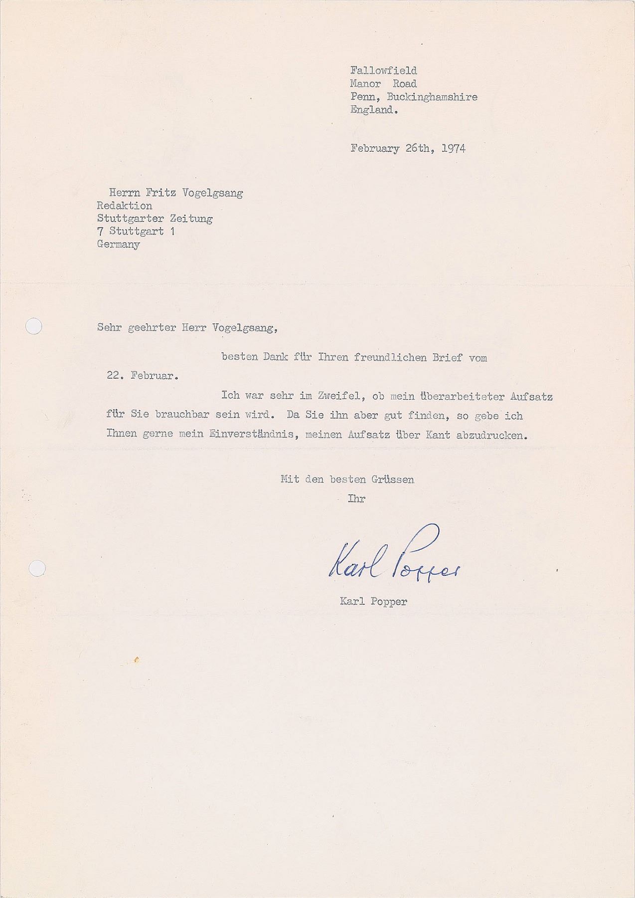 Immensely important philosopher of science (1902–1994). Group of three TLSs in German, each one page, 8.25 x 11.75, January–April 1974. To the editors of the 'Stuttgarter Zeitung' about of the imprint of his essay on the birthday of Immanuel Kant, with permission to print it, as well as the request for proofs and voucher copies. In overall fine condition, with file holes to the left edges. Accompanied by carbon copies of the original letters sent to Popper.