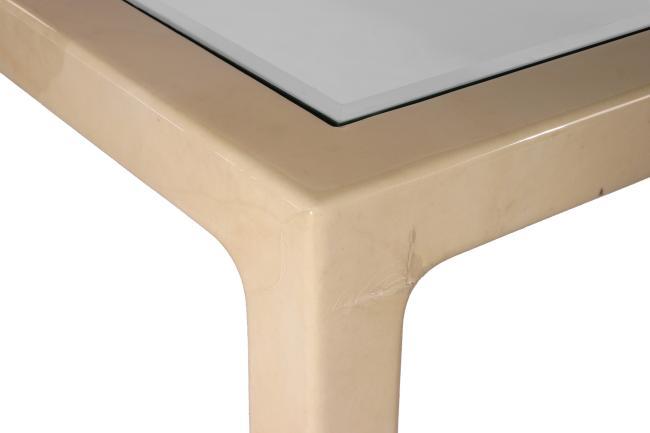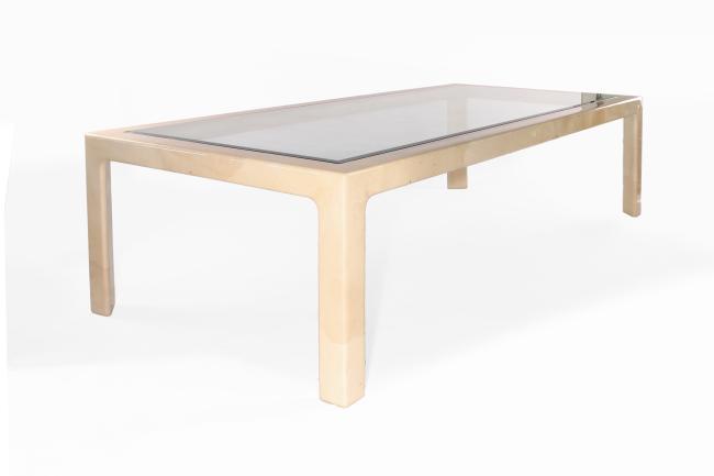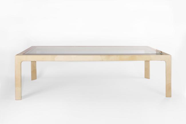 30h x 112w x 48d inches, lacquered wood, glas, original good condition, scratch on base