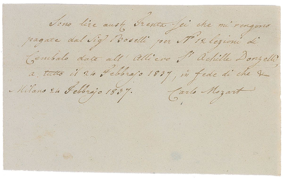 Second son of Wolfgang Mozart (1784–1858). ADS in Italian, signed “Carlo Mozart,” one page, 5.25 x 3, February 24, 1837. Receipt in which he confirms the receipt of 36 Italian lira for 12 harpsichord lessons he gave to Gaetano Donizetti’s son Achille. In fine condition, with a horizontal fold. Mozart had studied music at Milano, but then entered into civil service and served in the French administration of Lombardy, and later, after its insertion into the Austrian Empire in 1815, at the state accounting department in Milano. Although he had given up his musical studies decades earlier, this receipt shows he still maintained at least a modest interest in music.
