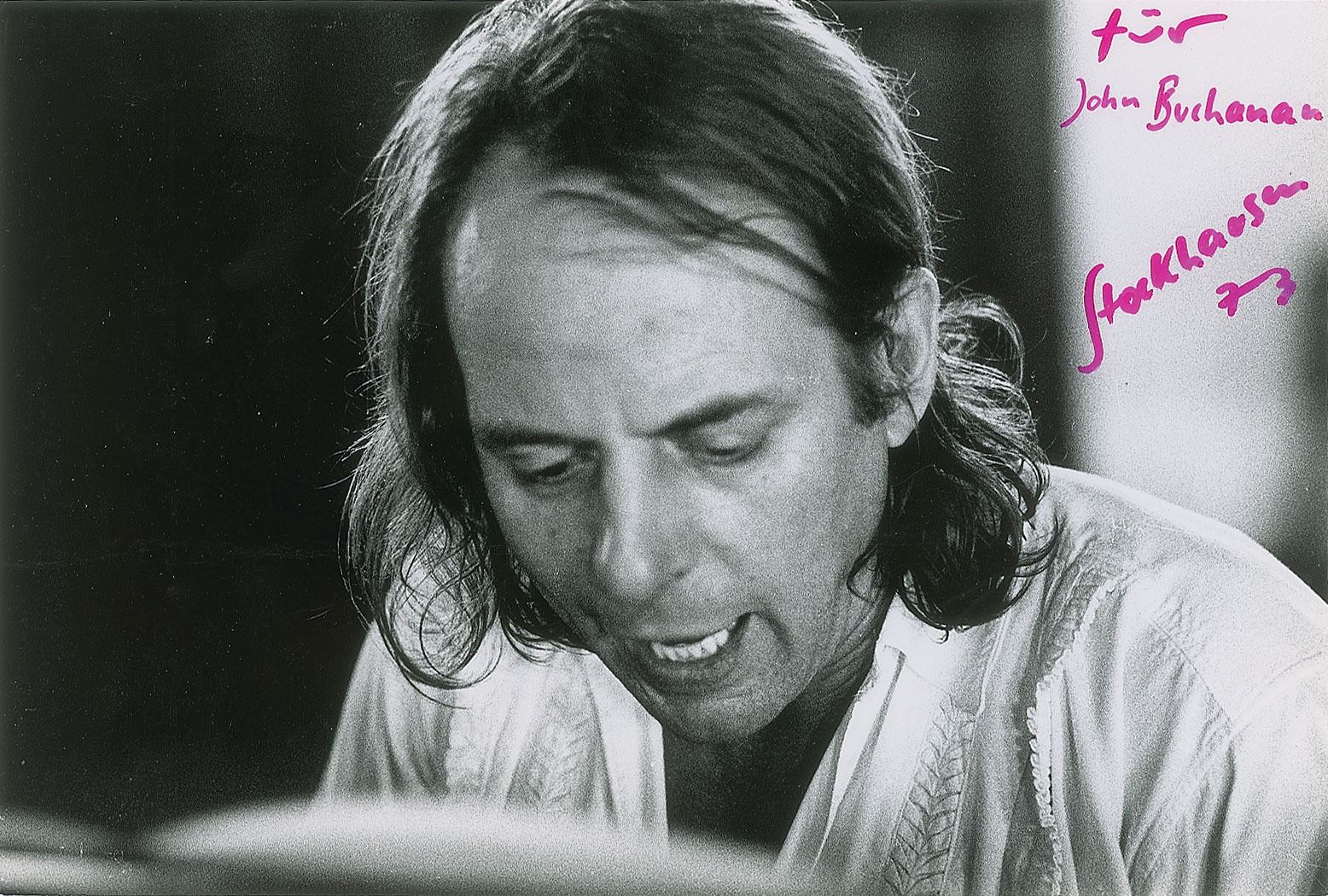 German composer (1928–2007), widely acknowledged by critics as one of the most important but also controversial composers of the 20th and early 21st centuries. He is best known for his groundbreaking work in electronic music, for introducing controlled chance into serial composition, and for musical spatialization. Uncommon glossy 9.5 x 6.25 photo of Karlheinz Stockhausen, signed and inscribed in pink felt tip, "Für John Buchanan, Stockhausen.” In very good to fine condition, with a light crease passing across his nose, an area of emulsion irregularity to his hairline, and a few light postal impressions.