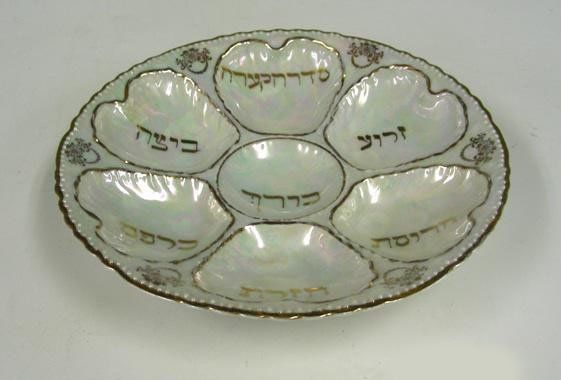 Circular form, modeled in relief with 6 heart shape receptables, inscribed in Hebrew with the name of the Seder dishes, alternating with scale motifs, radiating around a central depression.