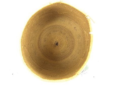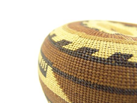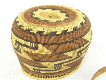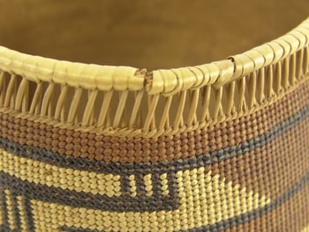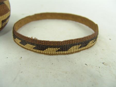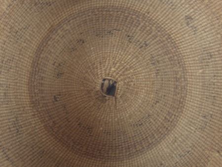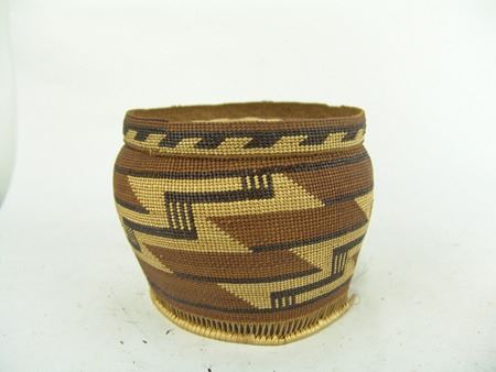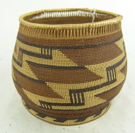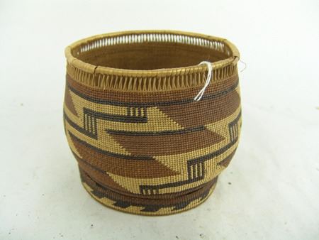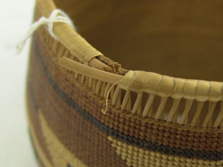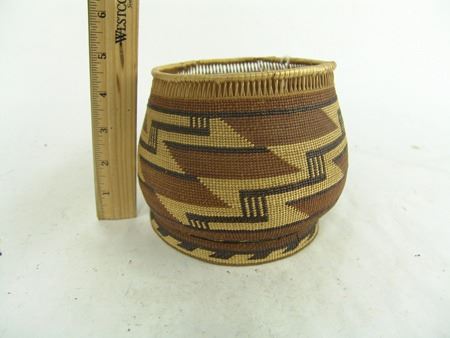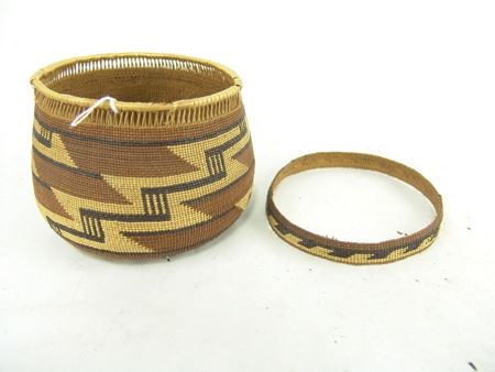 Early 1900s, Extra fine weave reverse design acorn basket with beautiful imbricated designs, including the bottom, and with a matching ring used as a display stand. Body in excellent condition, rim has broken rod and a few missing stitches. 4-3/4" x 6"
