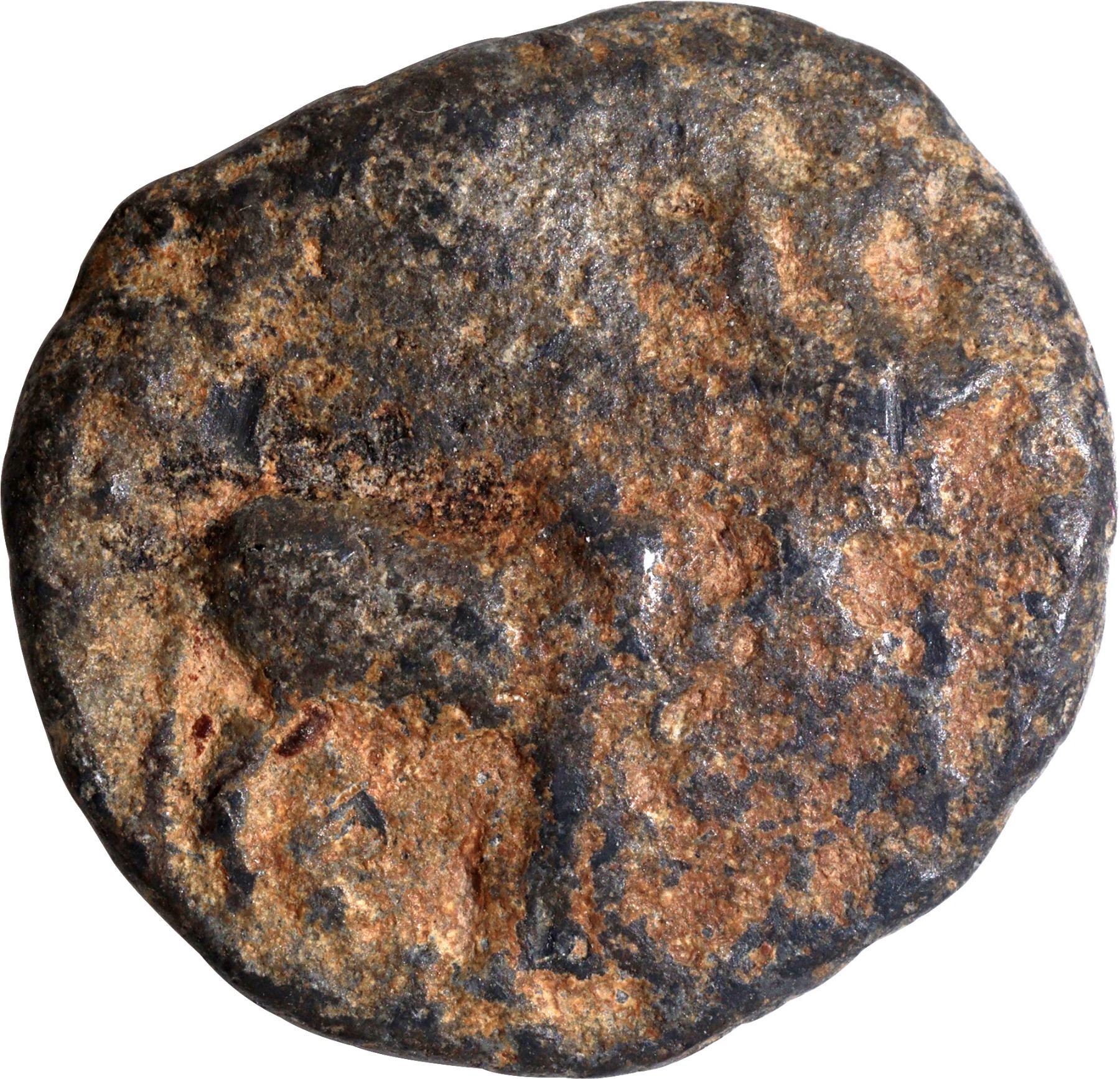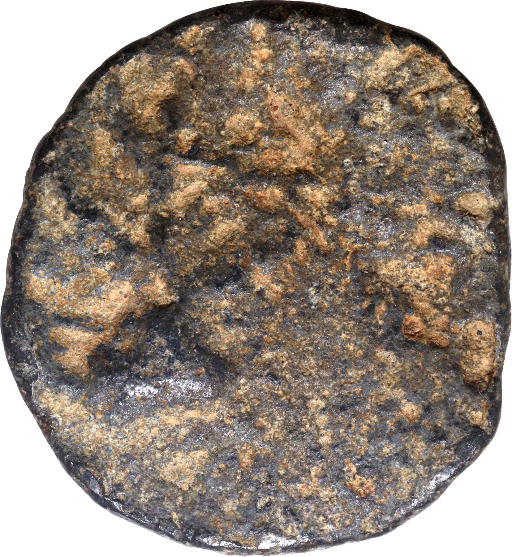 Pallavas of Kanchi (2-7 Century CE), Karur Region, Lead Unit, Obv: an upright bull facing right, in front a forked piece of object, Rev: a sprout/sacred tree, 4.8g, 18.7mm, (The Pallava Coins, R. Krishnamurthy # 10), choice quality, about extremely fine, Extremely Rare.